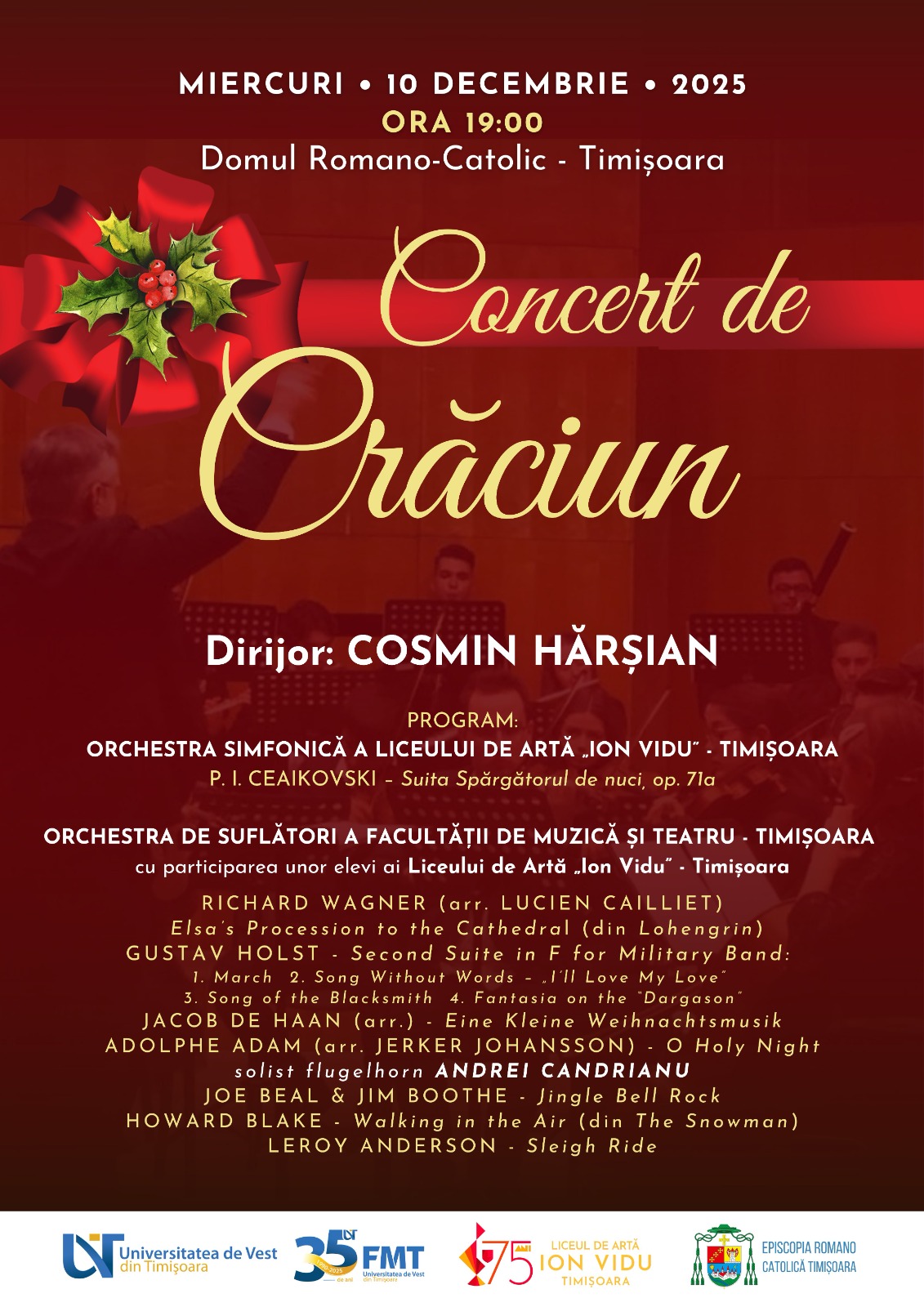 Vă așteptăm miercuri, 10 decembrie 2025, ora 19:00, la Domul Romano-Catolic din Timișoara, pentru a sărbători împreună frumusețea Crăciunului, într-un cadru plin de emoție și armonie.” (lect. univ. dr. Cosmin Hărșian, FMT-UVT)