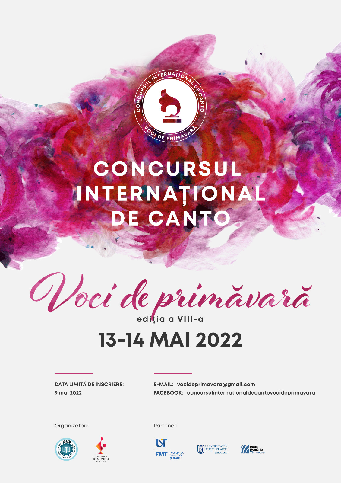 Liceul de Artă „Ion Vidu” din Timişoara organizează, în perioada 13 – 14 mai 2022, cu sprijinul Inspectoratului Şcolar Judeţean Timiş, a opta ediţie a Concursului Internaţional de Canto „Voci de primăvară”, în parteneriat cu Facultatea de Muzică şi Teatru a Universităţii de Vest din Timişoara şi Universitatea „Aurel Vlaicu” din Arad.