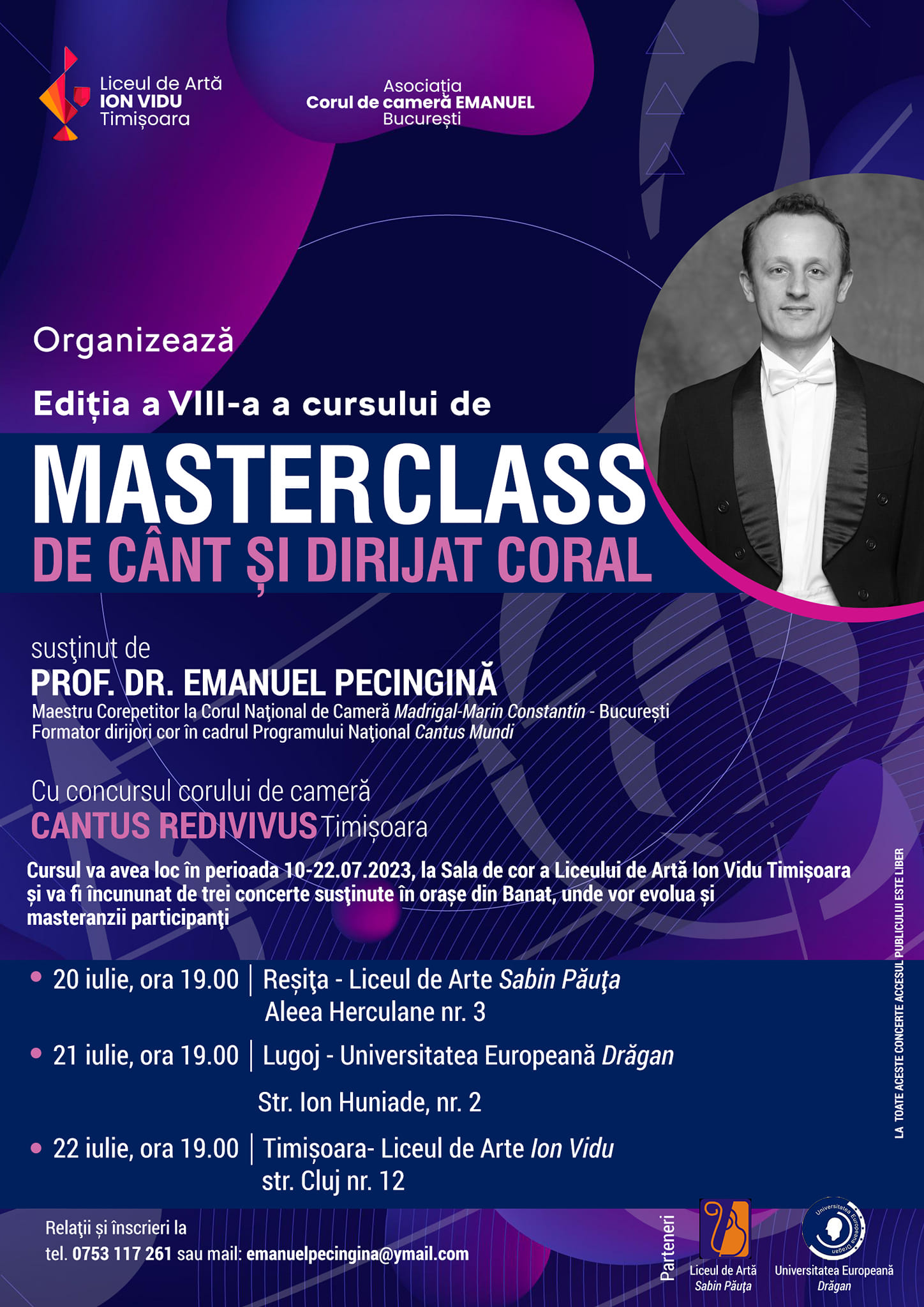 A opta ediție a Masterclass-ului de Cânt și Dirijat Coral susținut de prof. dr. Emanuel Pecingină, cu concursul Corului de Cameră CANTUS REDIVIVUS, s-a desfășurat în aceste zile la Liceul de Artă „Ion Vidu” din Timișoara.