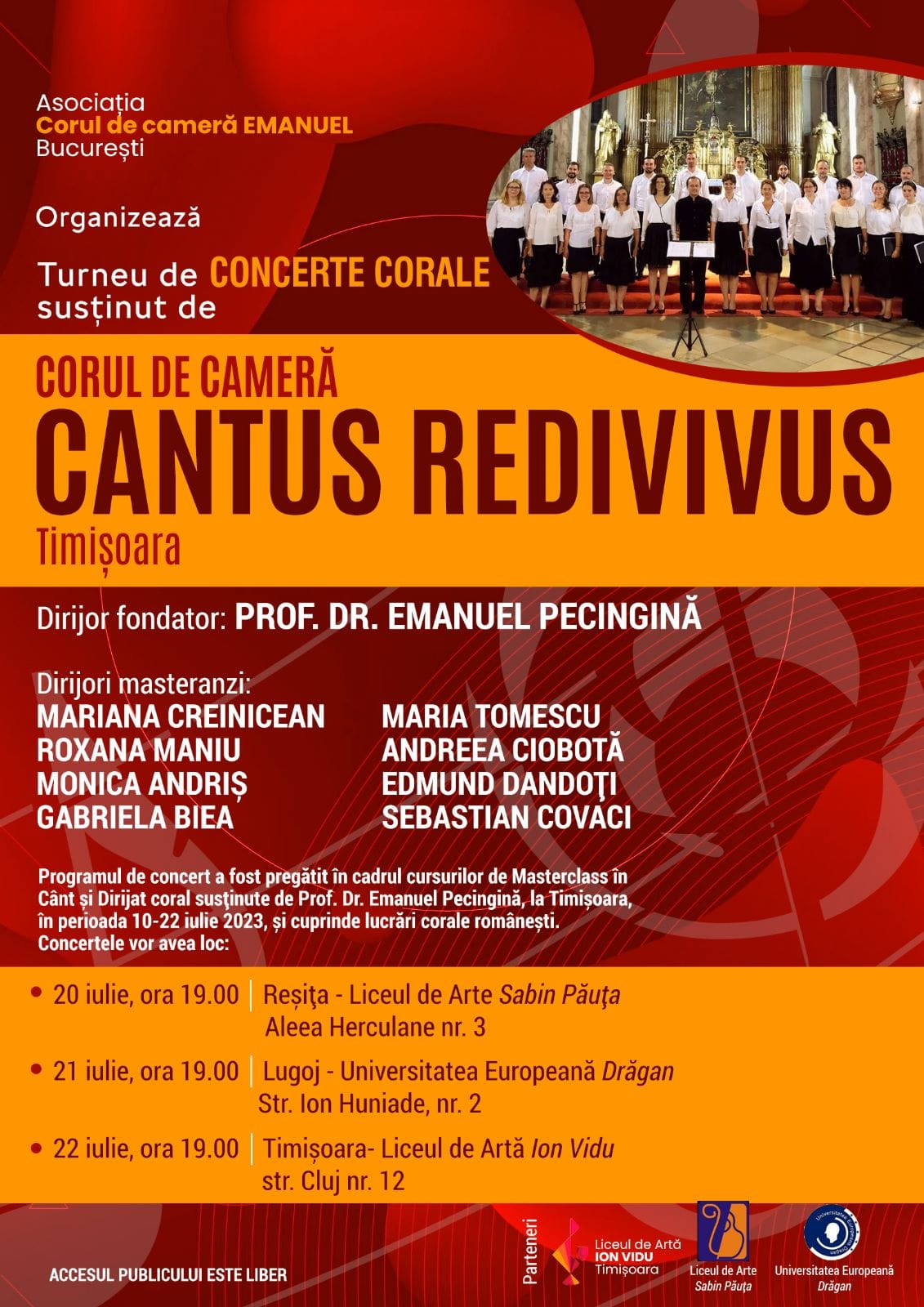 La finalul cursului, Corul de Cameră CANTUS REDIVIVUS prezintă, prin tradiție, o serie de concerte. Ediția actuală a turneului se deschide joi, 20 iulie 2023, la Reșița (Liceul de Arte „Sabin Păuța”), al doilea concert va avea loc vineri, 21 iulie 2023, la Lugoj (Universitatea Europeană Drăgan), iar concertul din închiderea turneului este programat sâmbătă, 22 iulie 2023, la Timișoara (Liceul de Artă „Ion Vidu”).
