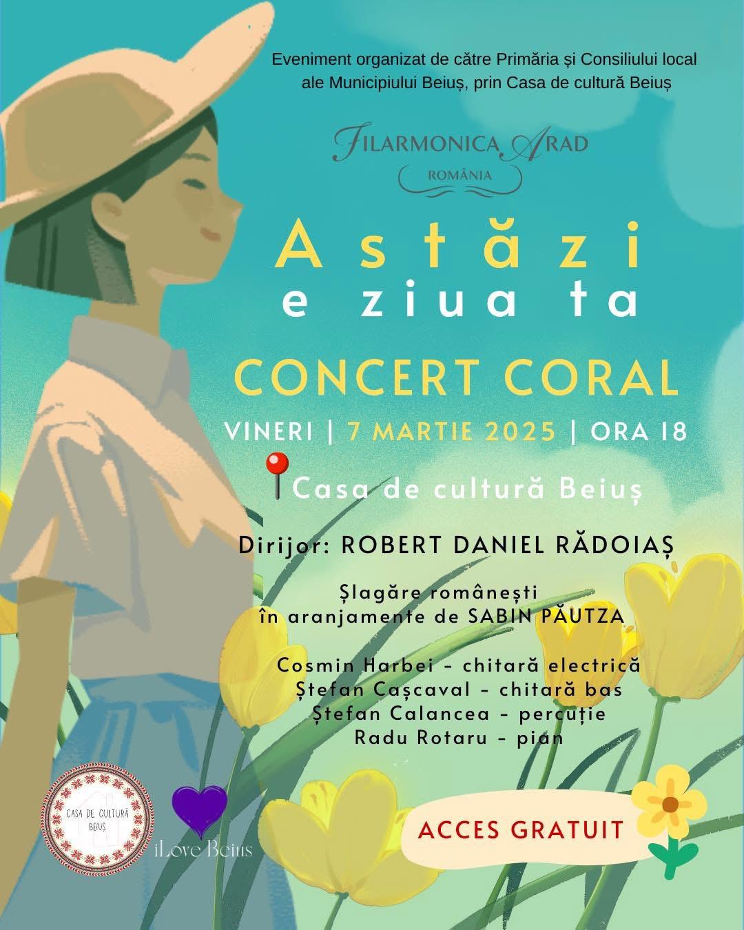Concertul coral „Astăzi e ziua ta” va fi prezentat, joi și vineri, la Arad (6 martie 2025, ora 19:00, Sala Palatului Cultural) și la Beiuș (7 martie 2025, ora 18:00, Casa de Cultură).