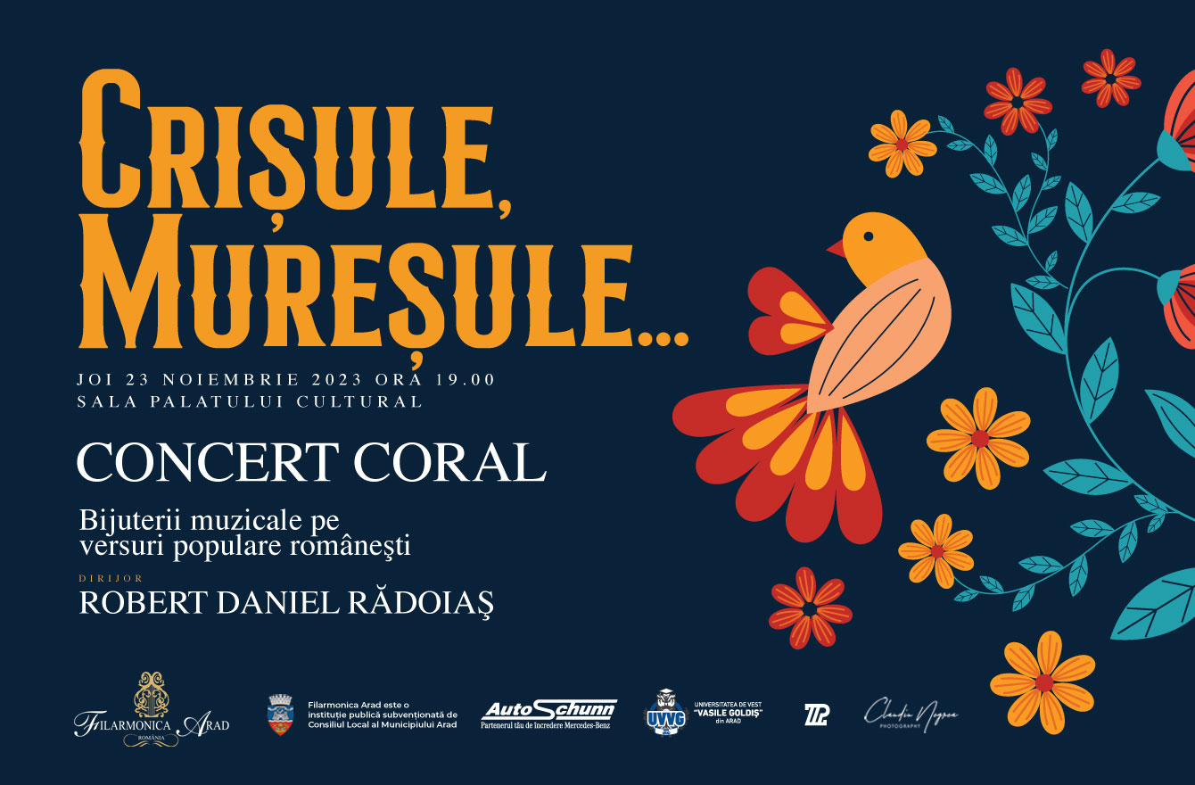 Corul Academic al Filarmonicii Arad, dirijat de maestrul Robert Daniel Rădoiaș, prezintă Concertul Coral „CRIŞULE, MUREŞULE…”, cu bijuterii corale pe versuri populare. Evenimentul coral se va desfășura joi, 23 noiembrie 2023, începând cu ora 19:00, la Sala Palatului Cultural din Arad.