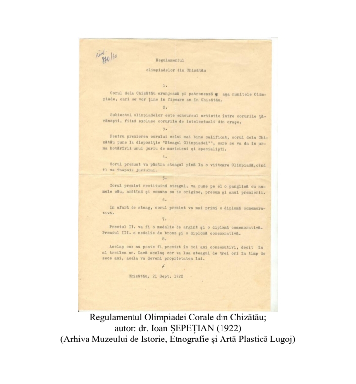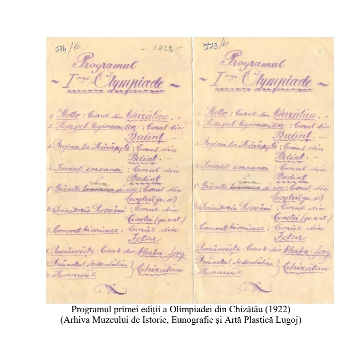 Duminică, 23 octombrie 2022, vom încerca să evocăm Chizătăul de altădată, leagăn al mișcării corale românești în vremuri de restriște națională. Vor fi prezente în cadrul Olimpiadei, pe scena Căminului Cultural din Chizătău, începând cu ora 14, Corul „Doina Banatului” al Parohiei Ortodoxe Române din Timișoara – Iosefin (dirijor Florin-Nicolae Șincari), Corala „Sargeția” din Deva (dirijată de Mihaela Popa), Corul de Copii al Academiei de Arte „Lugoj Clasic” (dirijat de profesor Claudia Crețiu), Corul „Laude” din Moniom (dirijat de Georgiana Ciucur), Corul „Învierea” al Bisericii Ortodoxe „Sfântul Mare Mucenic Dimitrie” din Teregova (dirijor Ioan Surdu) și Corul „Armonia” al Parohiei Ortodoxe Române din Șag (dirijat de preotul Florin Ioan Băran).