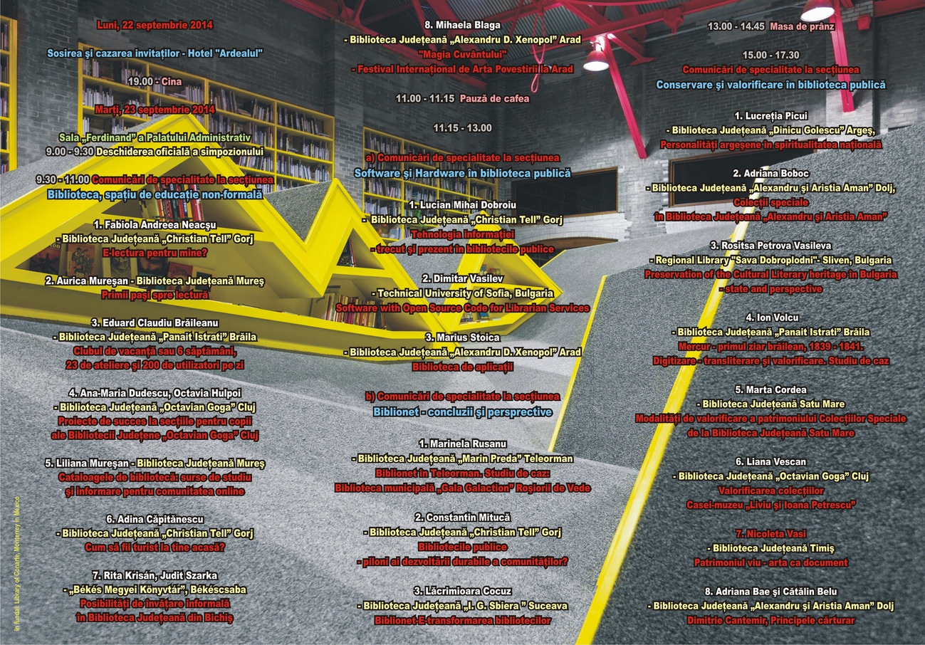 Cele patru secţiuni ale simpozionului vor permite intervenţii, ce vor face referire la metode diverse de informare şi de educaţie folosite în bibliotecile publice; de la cele clasice, la cele non – formale şi media.