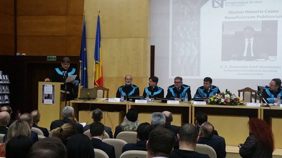 Ambasadorul României în Germania, Emil Hurezeanu, a primit astăzi titlul de Doctor Honoris Causa al Universității de Vest din Timișoara. Titlul i-a fost înmânat în cadrul unei ceremonii organizate în Aula Magna a Universității de Vest.