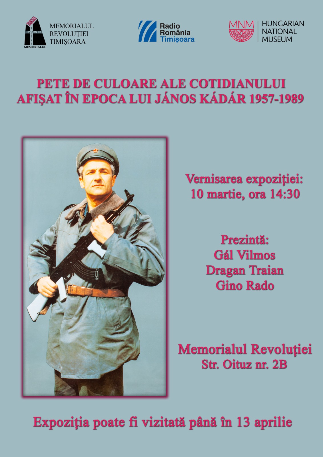 Patruzeci de afișe din colecția Muzeului Național Maghiar de la Budapesta pot fi văzute, până în 13 aprilie 2023, în expoziția intitulată „Pete de culoare ale cotidianului afișat în epoca lui János Kádár (1957 – 1989)”, expoziție găzduită de Memorialul Revoluției din Timișoara, cu sediul pe strada Oituz nr. 2 B.