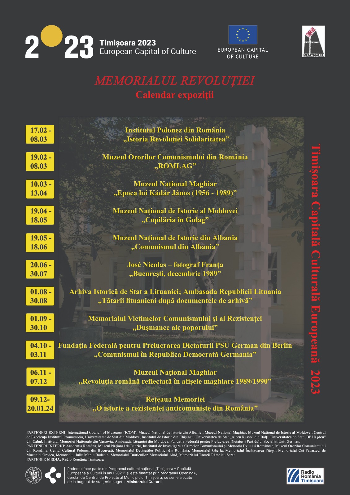 Printre expozițiile perfectate se vor regăsi și alte expoziții surprize. De exemplu, la începutul lunii aprilie 2023, vom avea o expoziție de fotografii, din Ucraina, realizate de o jurnalistă din Republica Moldova, de origine română, care a făcut aceste fotografii în regiunea Harkov și Kiev, imediat după retragerea trupelor rusești din acele zone, o expoziție impresionantă, o expoziție prin care și noi dorim să atragem atenția asupra războiului care este aproape de noi. Trebuie să încercăm și noi să fim alături de poporul ucrainean.” apreciază Gino Rado, președintele Asociației „Memorialul Revoluției 16-22 Decembrie 1989” din Timișoara.