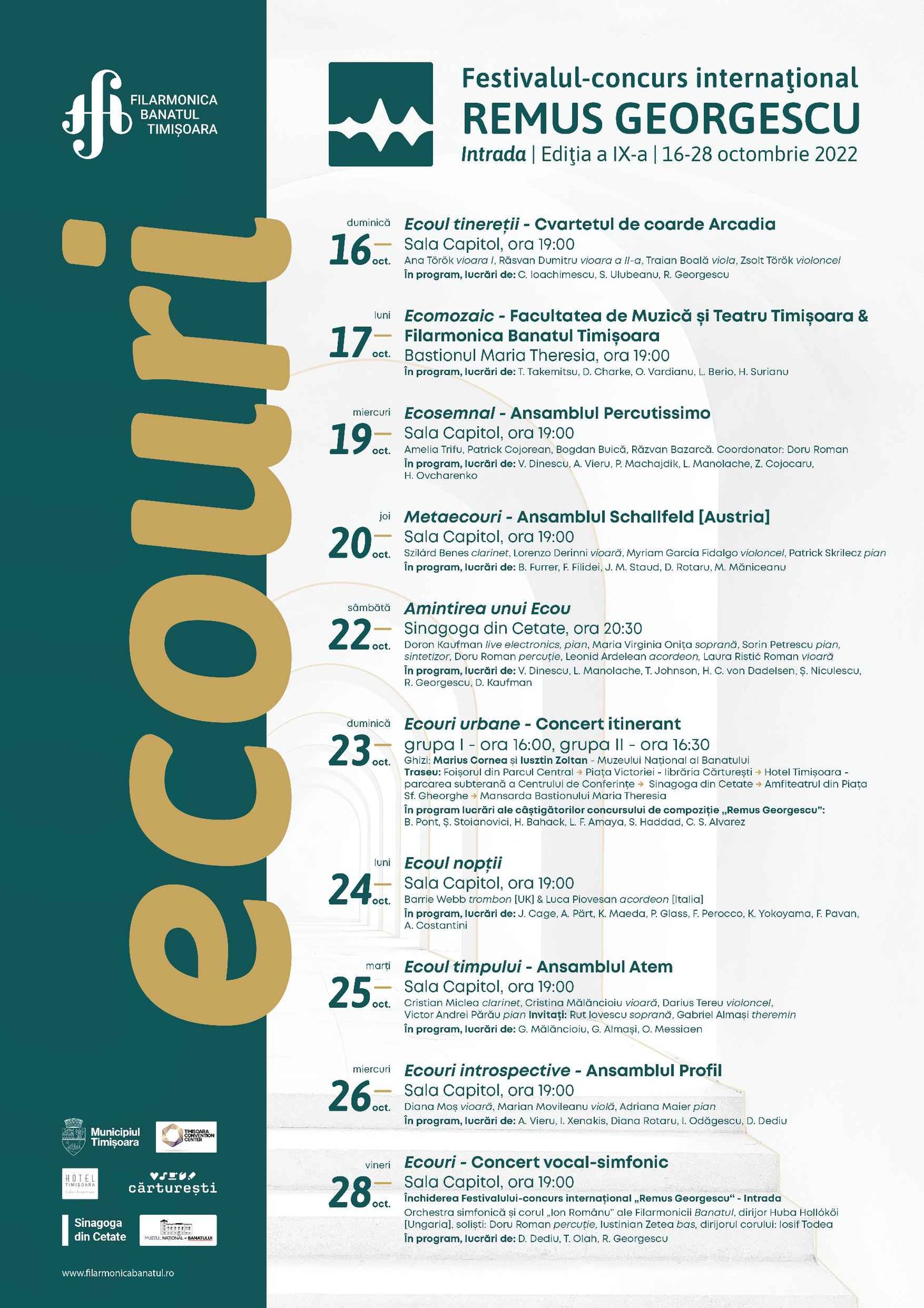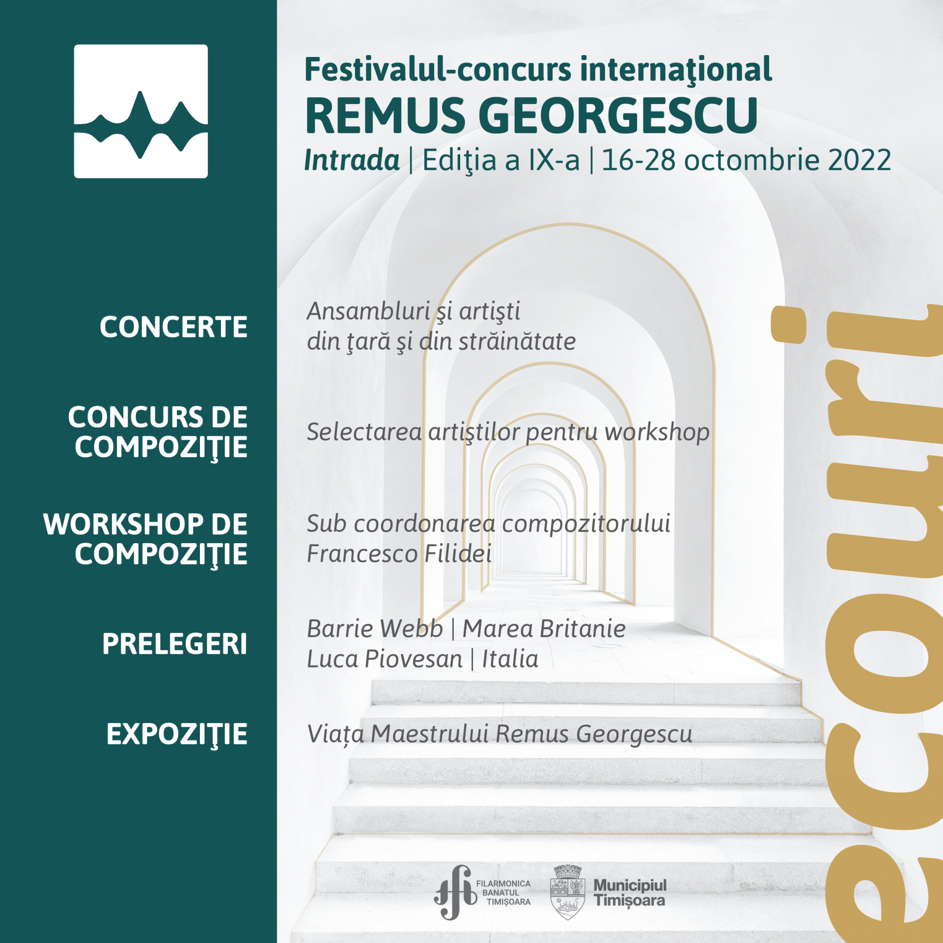 Festivalul-Concurs Internațional „Remus Georgescu” prezintă, în perioada 16 – 28 octombrie 2022, o serie de zece evenimente, dedicate muzicii contemporane. Tema ediției actuale este „Ecouri”, după lucrarea omonimă a maestrului omagiat – REMUS GEORGESCU, compozitor, dirijor, pedagog.