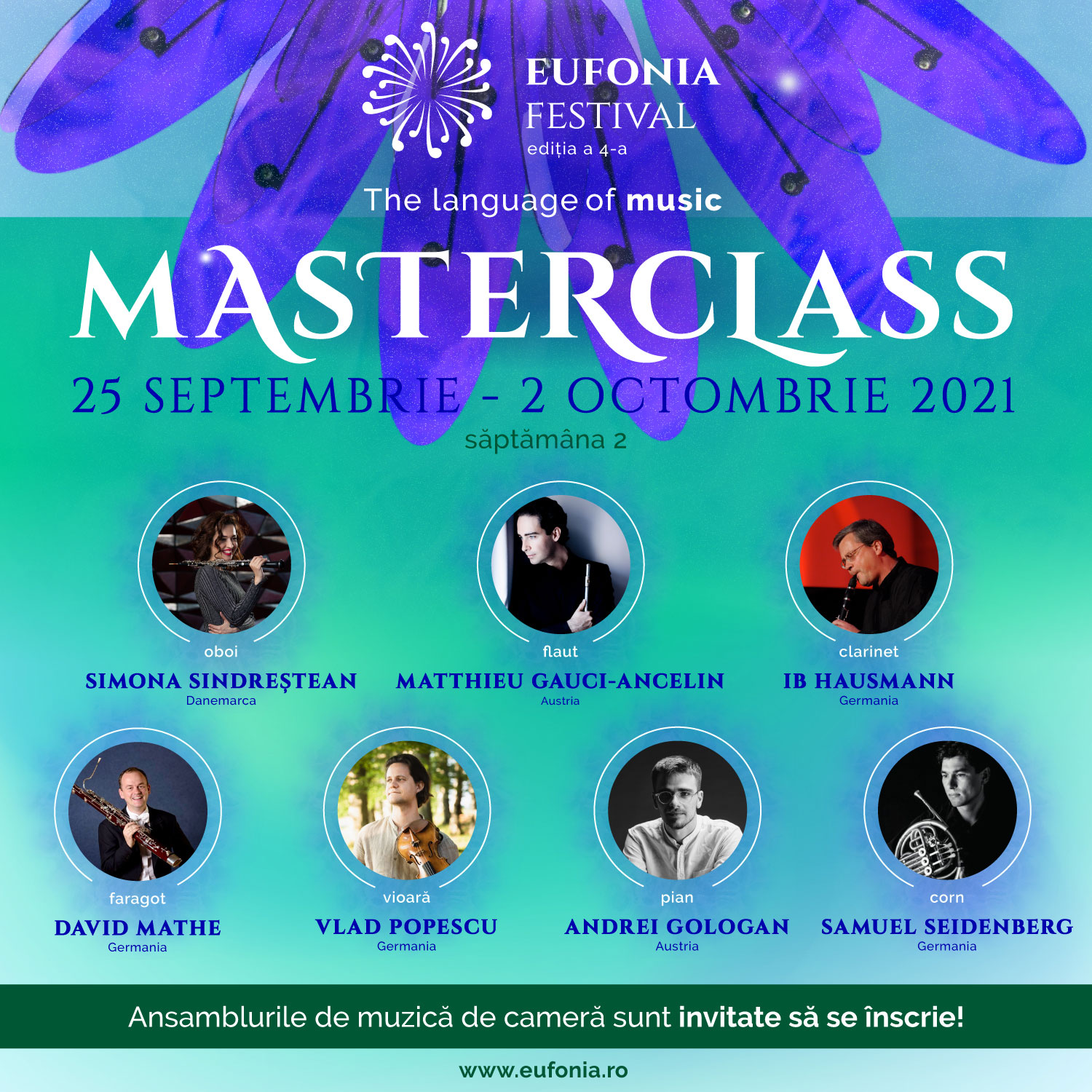 În cadrul “Eufonia Festival – The language of music” vor participa 12 muzicieni internaţionali de excepţie, invitaţi să concerteze şi să predea cursuri de măiestrie interpretativă: violonista Nurit Stark (Israel) şi violonistul Vlad Popescu (Germania), pianiştii Cedric Pescia (Elveţia) şi Andrei Gologan (Austria), violoncelistul Stephan Forck (Germania), violistul Manuel Hofer (Austria), flautistul Matthieu Ancelin (Franţa), fagotistul David Mathe (Germania), clarinetistul Ib Hausmann (Germania), Simona Sindreştean la oboi (Danemarca) şi cornistul Samuel Seidenberg (Germania).