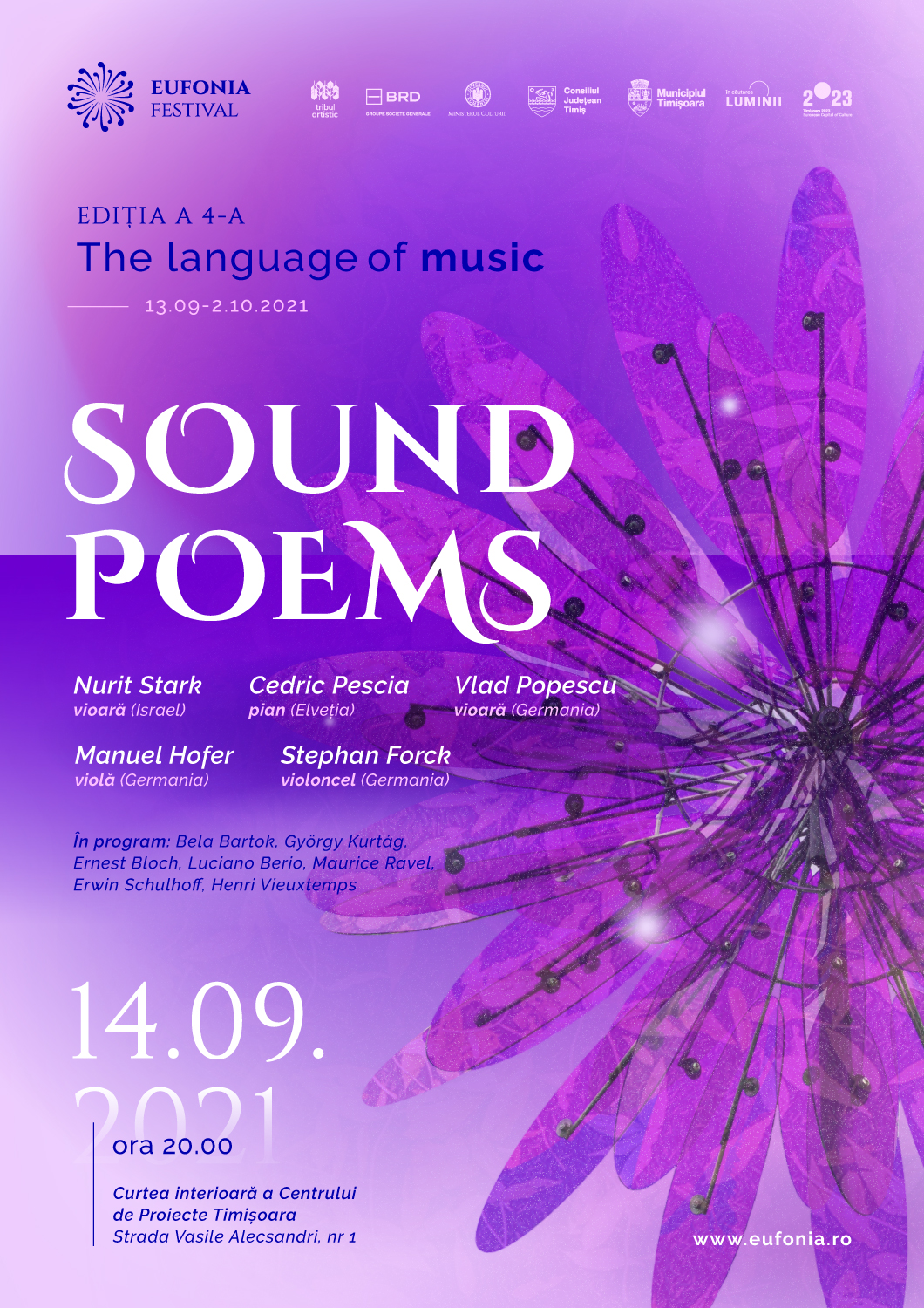 “Sound Poems” este primul concert din cadrul Festivalului Eufonia – The language of music şi va avea loc marţi, 14 septembrie, ora 20, în Curtea interioară a Centrului de Proiecte Timişoara, strada Vasile Alecsandri nr. 1.