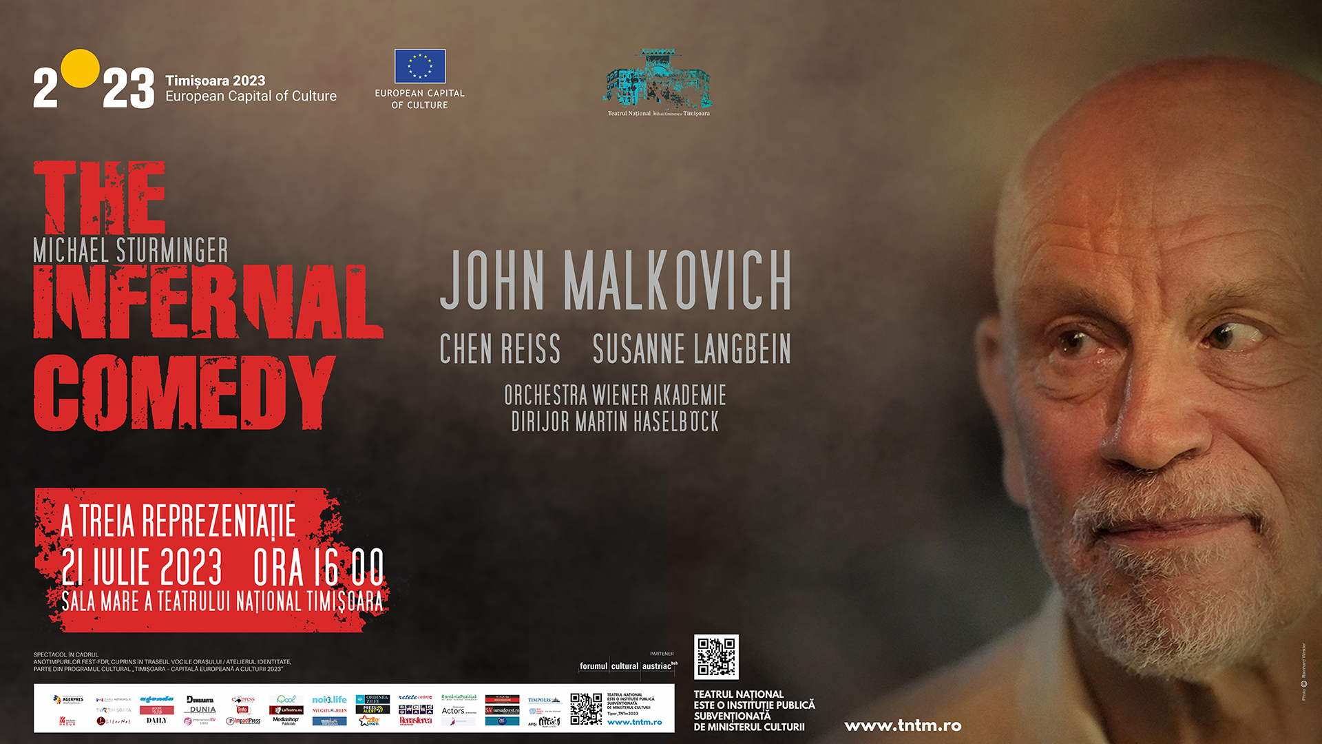Joi, 20 iulie, ora 19:00, și vineri, 21 iulie 2023, de la orele 16:00 și 19:00, Teatrul Național prezintă spectacolul THE INFERNAL COMEDY/COMEDIE INFERNALĂ, avându-l protagonist pe celebrul actor american JOHN MALKOVICH, unul dintre cei mai renumiți actori ai contemporaneității, dublu nominalizat la Oscar, la Globul de Aur și premiile BAFTA.