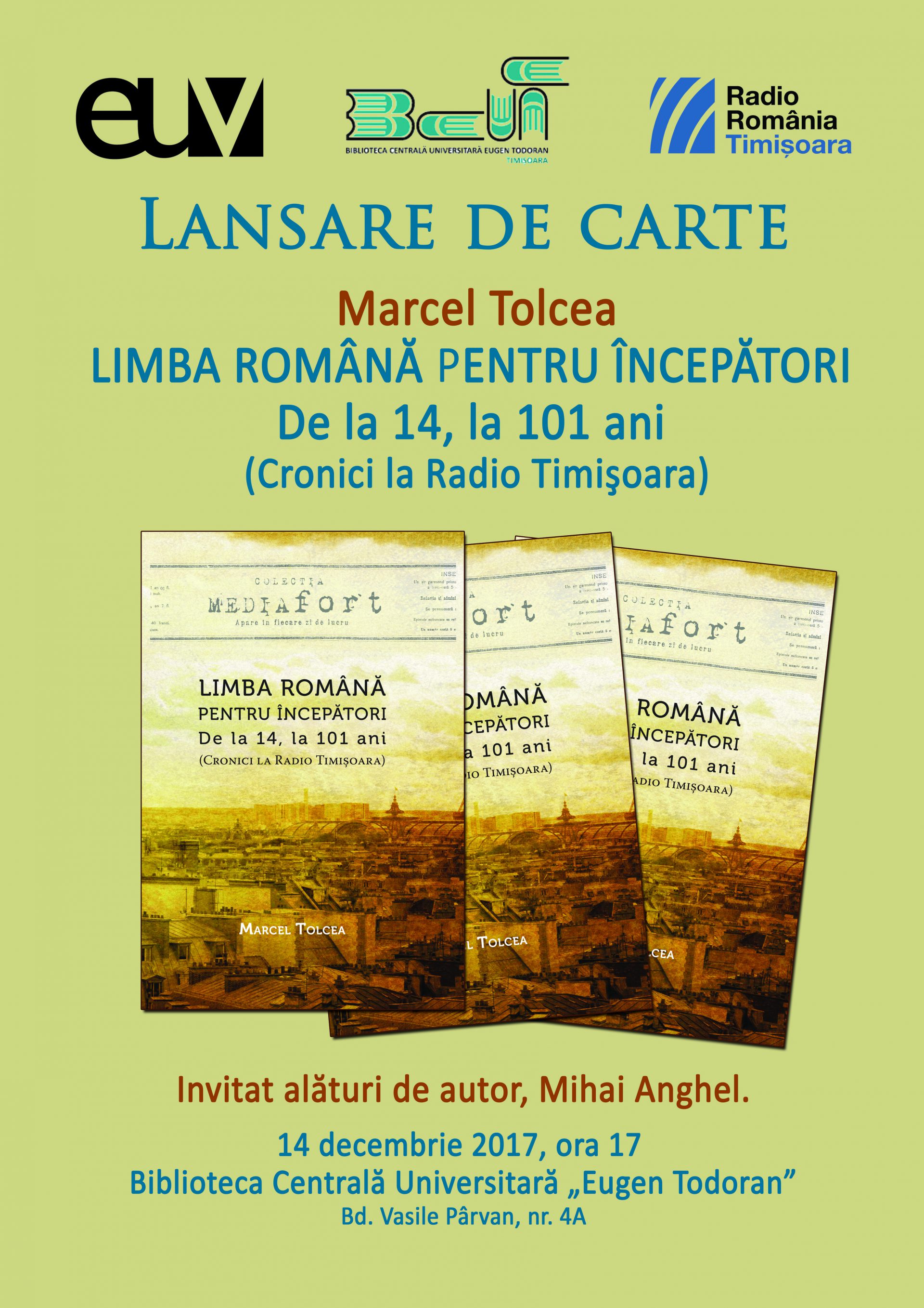 Rubricile de limba română pe care le ascultați în fiecare zi la Radio Timișoara, prezentate de prof. univ. dr. Marcel Tolcea, se regăsesc acum într-o carte cu titlul Limba română pentru începători de la 14 la 101 ani. Cronici de limba română la Radio Timișoara. Cartea, disponibilă deja în librării, a apărut la editura Universității de Vest, sub egida Radio Timișoara și a fost lansată joi, 14 decembrie 2017, de la ora 17.00, la Biblioteca Centrală Universitară ”Eugen Todoran” din Timișoara.