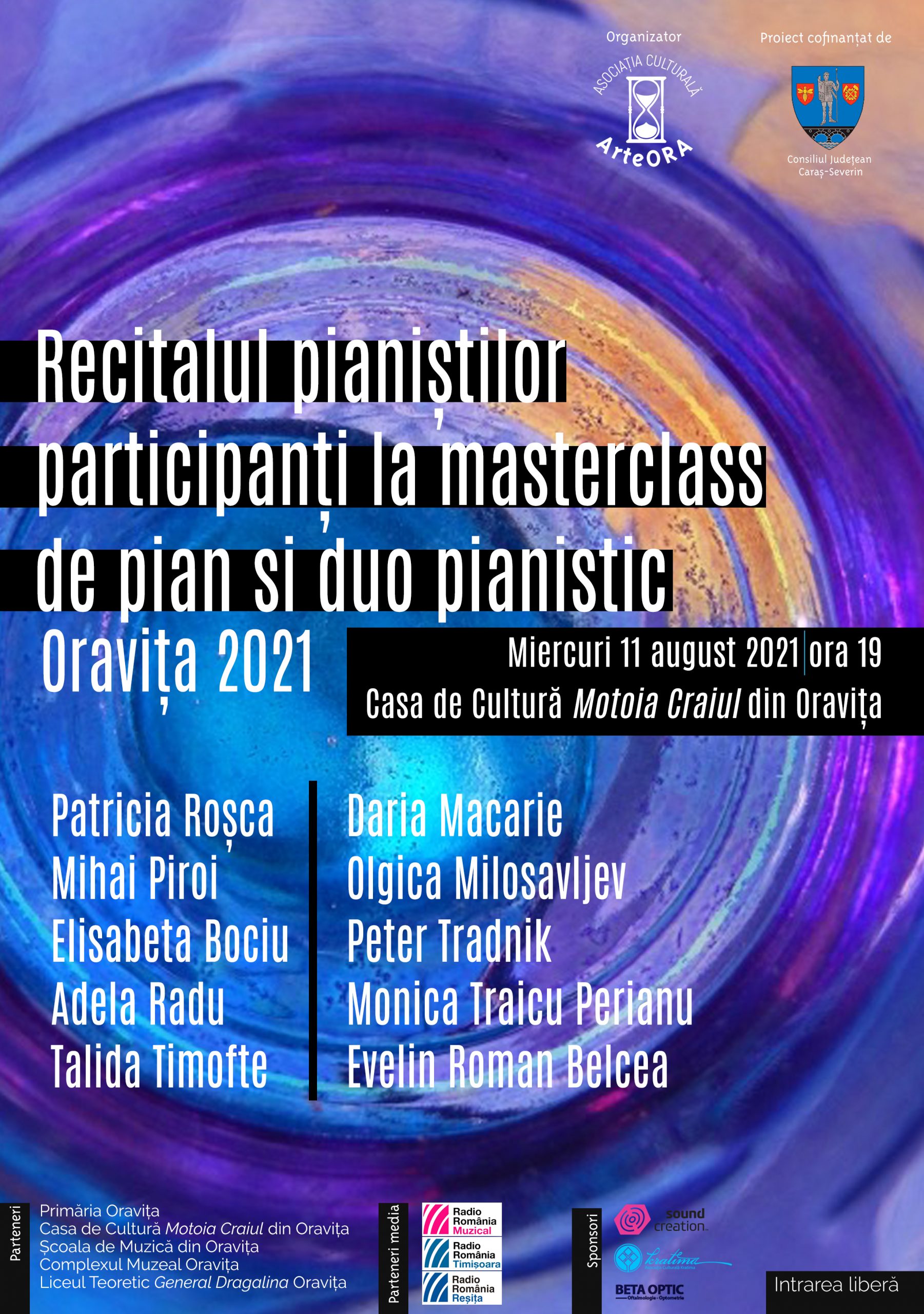 În perioada 5 – 11 august, la Oraviţa se va desfăşura „Masterclass de pian şi duo pianistic” susţinut de pianiştii: Manuela Iana Mihăilescu, Prof, univ. dr. habil., Facultatea de Muzică şi Teatru a Universităţii de Vest din Timişoara şi Dragoş Mihăilescu, solist concertist al Filarmonicii „Banatul” din Timişoara.