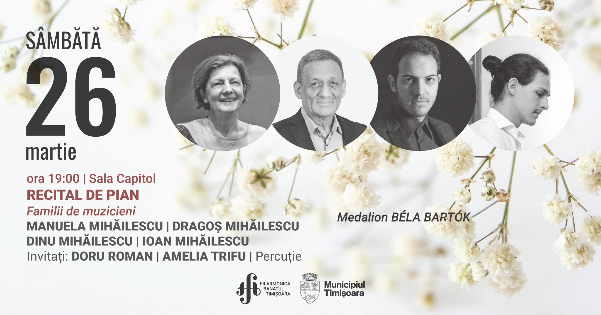 Sub genericul „Familii de muzicieni”, pianiştii Manuela Iana Mihăilescu, Dragoș Mihăilescu, Dinu Mihăilescu şi Ioan Mihăilescu prezintă „Medalion Béla Bartók”, în recitalul care va avea loc sâmbătă, 26 martie, ora 19, pe scena Filarmonicii „Banatul” din Timişoara.