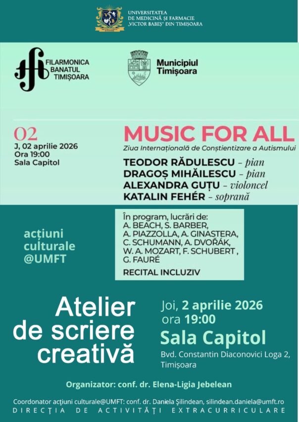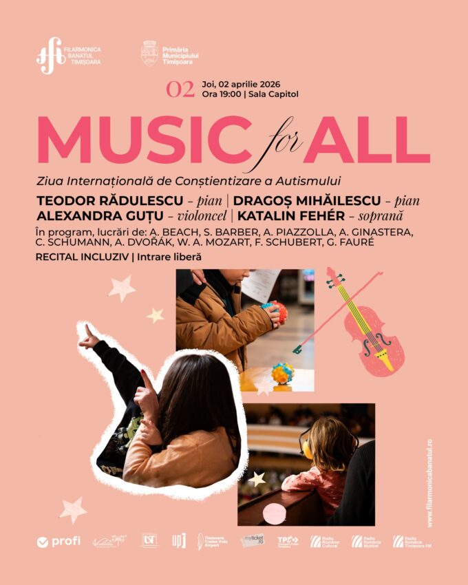 Cu prilejul Zilei Intenaționale de Conștientizare a Autismului, Filarmonica „Banatul” Timișoara și Facultatea de Muzică și Teatru – UVT prezintă recitalul incluziv MUSIC FOR ALL, astăzi, 2 aprilie 2026, ora 19:00, la Sala „Capitol”.
