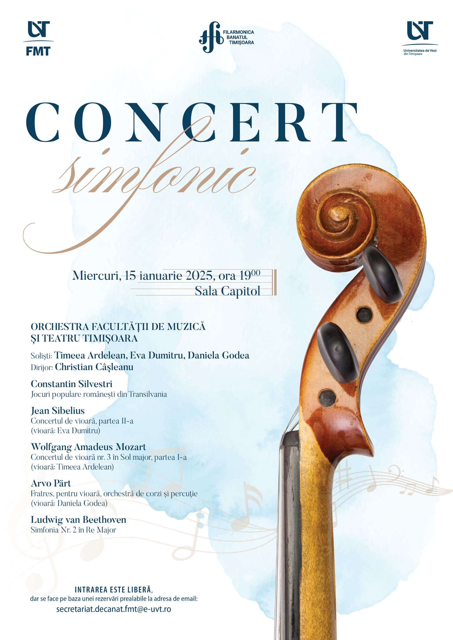Concertul simfonic va fi miercuri, 15 ianuarie 2025, la ora 19:00, în Sala Capitol”, cu Orchestra Facultății de Muzică și Teatru din Timișoara, cu solistele Timeea Ardelean, Eva Dumitru și Daniela Godea. Intrarea este liberă, pe bază de rezervări.