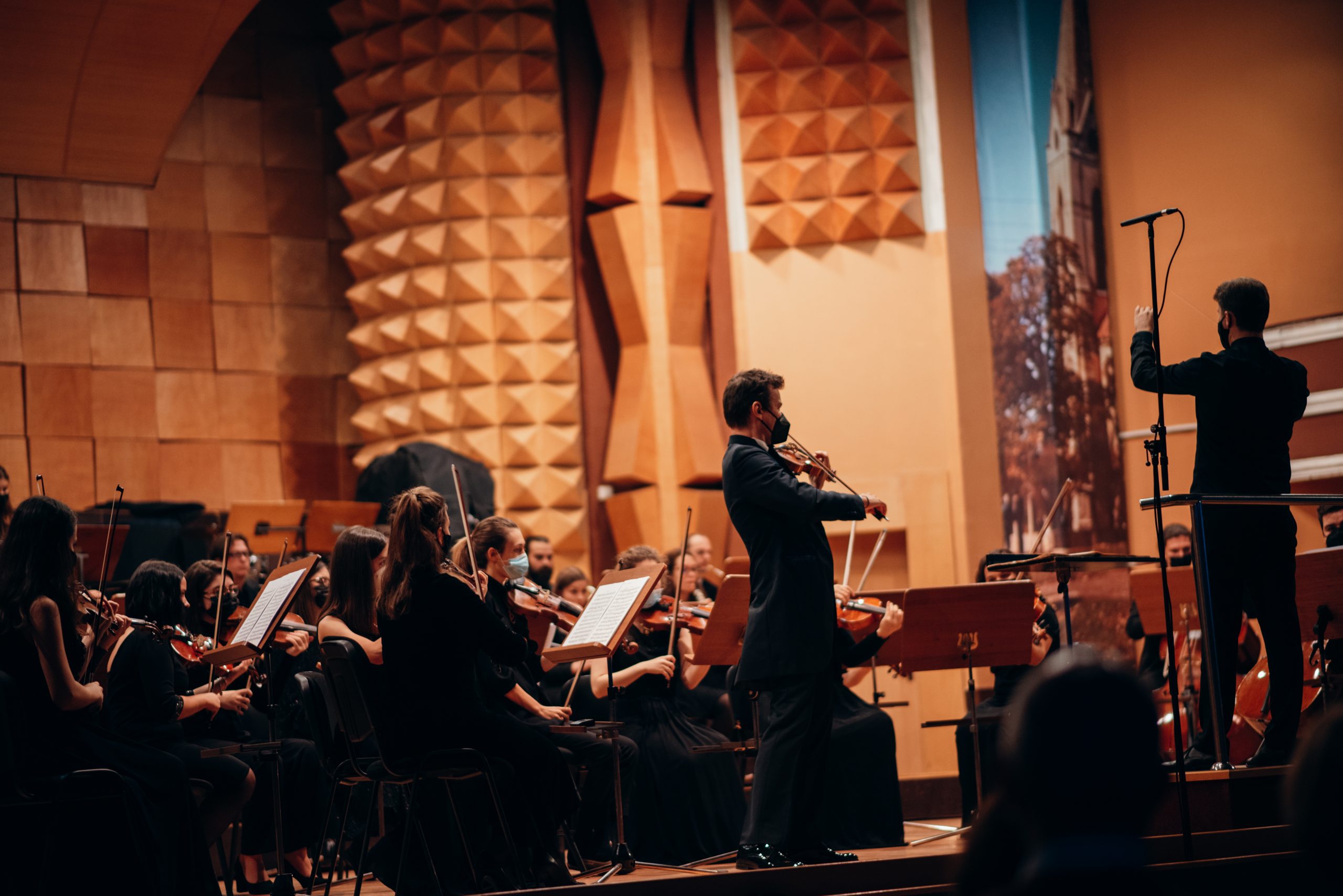 Concertul extraordinar susţinut de Orchestra Facultăţii de Muzică şi Teatru a Universităţii de Vest din Timişoara, dirijor – Sebastian Felea, solist – violonistul Alexandru Tomescu, la Auditorium Parco della Musica – Sala Petrassi din Roma (Italia), în 30 noiembrie 2021, ora 19:30 (ora Italiei), va cuprinde: