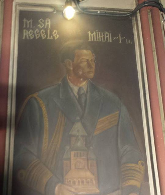Regele era pictat cu coroană pe cap, cu o mantie roşie cu puncte albe. Răufăcătorii au aruncat cu aurolac, pentru că se ştie că după Revoluţie regele nu a fost văzut cu ochi buni de foarte mulţi foşti comunişti. S-a făcut o curăţire a portretelor. Regele a fost pictat în haine militare. Lucrarea a făcut-o preoteasa Ana, care locuieşte acum în Italia. I-a lăsat doar faţa iniţială.