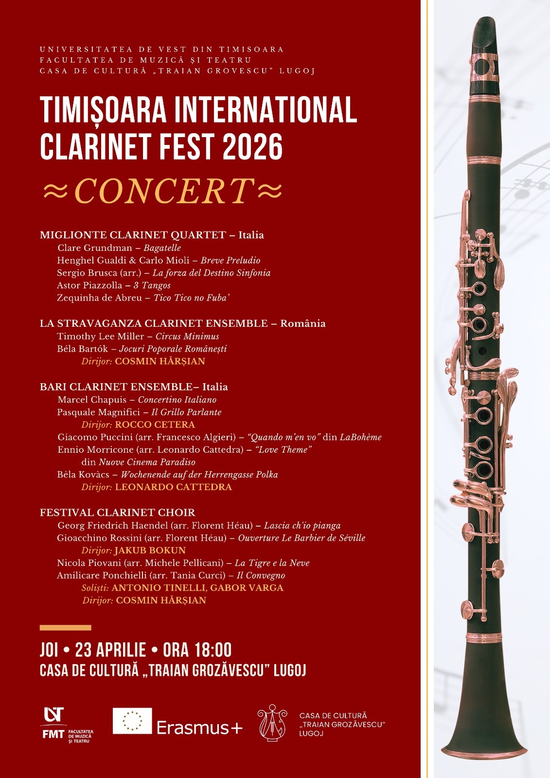 Programul TIMIȘOARA INTERNATIONAL CLARINET FEST 2026 cuprinde masterclassuri, workshopuri, recitaluri și concerte, la Timișoara și Lugoj, susținute de artiști și cadre didactice de prestigiu din instituții muzicale europene (Italia, Ungaria, Polonia, Elveția și România).
