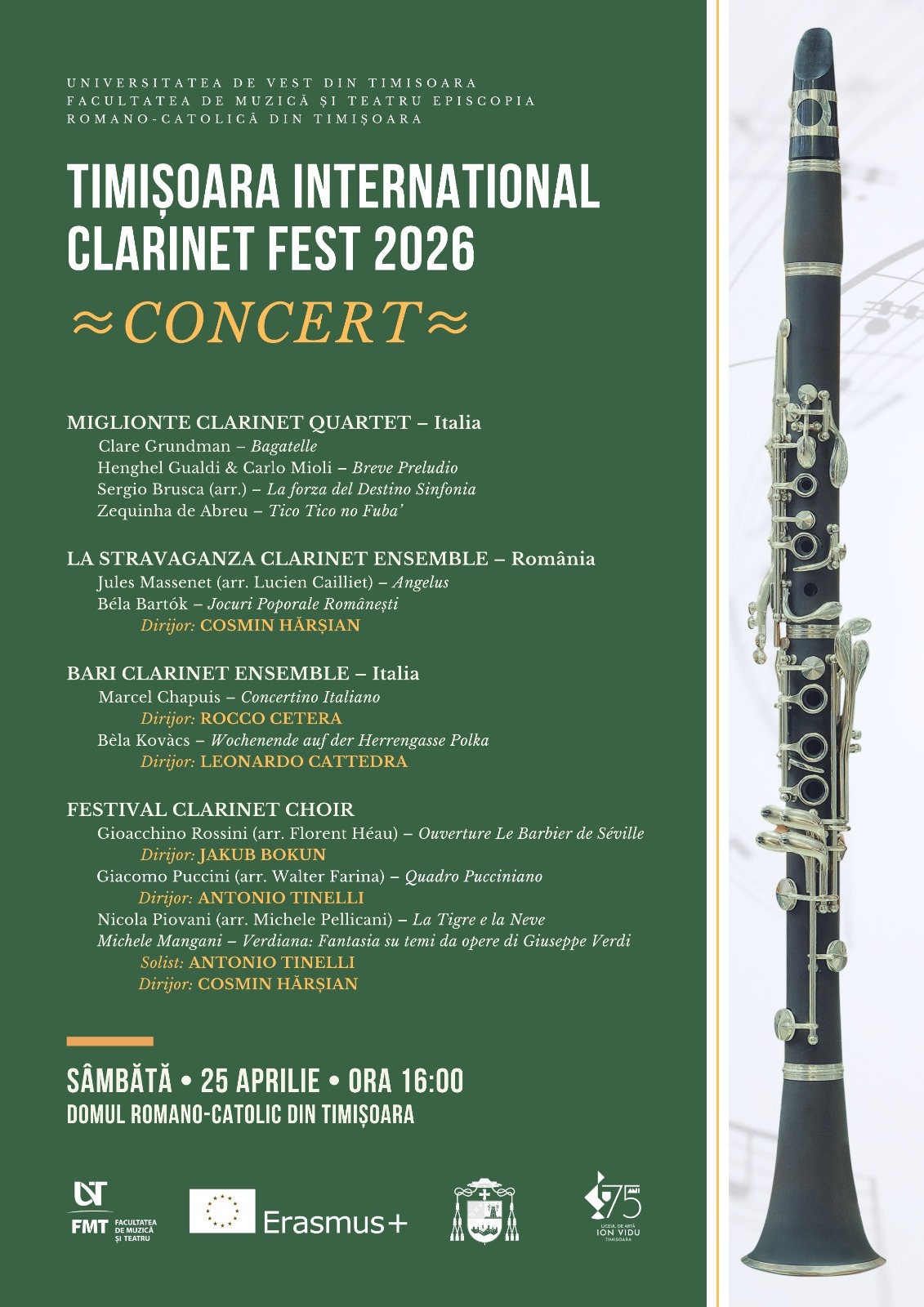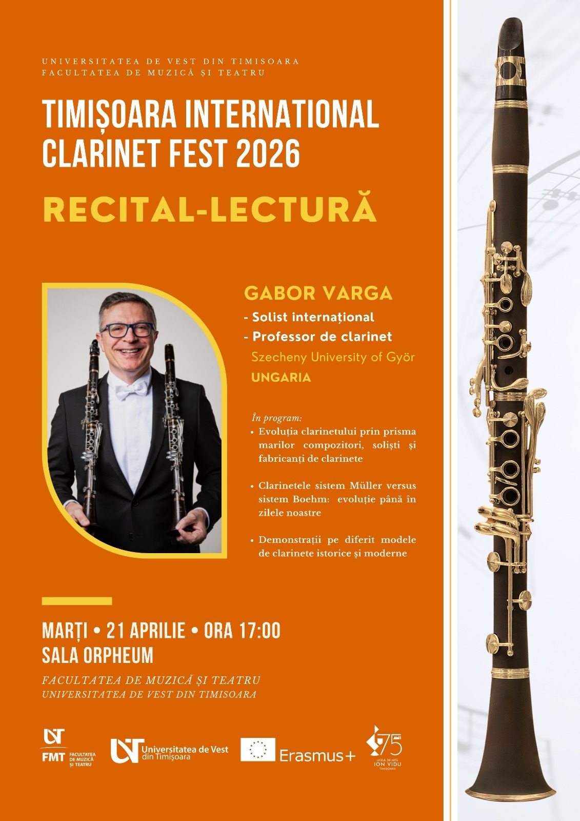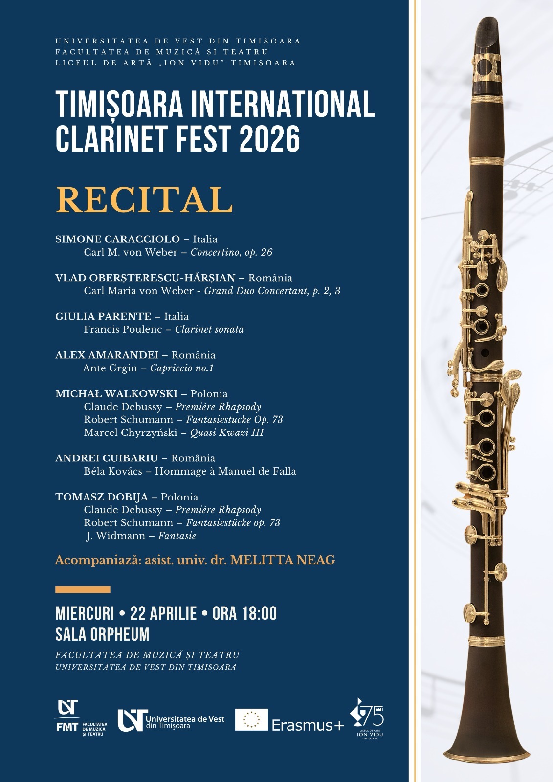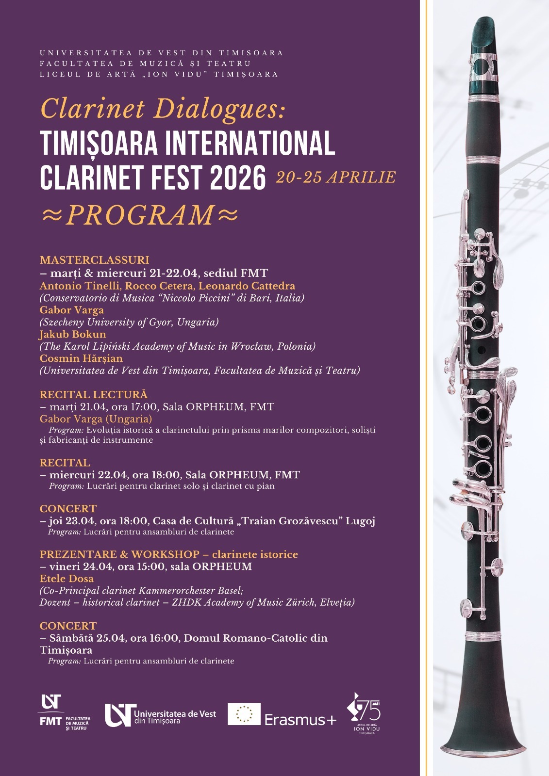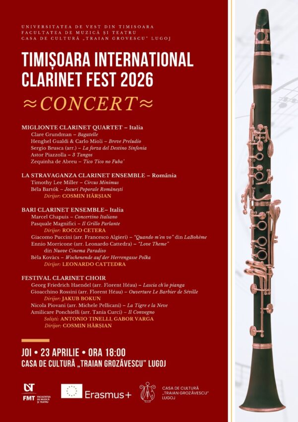 Facultatea de Muzică și Teatru – UVT organizează, în perioada 20 – 25 aprilie 2026, TIMIȘOARA INTERNATIONAL CLARINET FEST 2026.