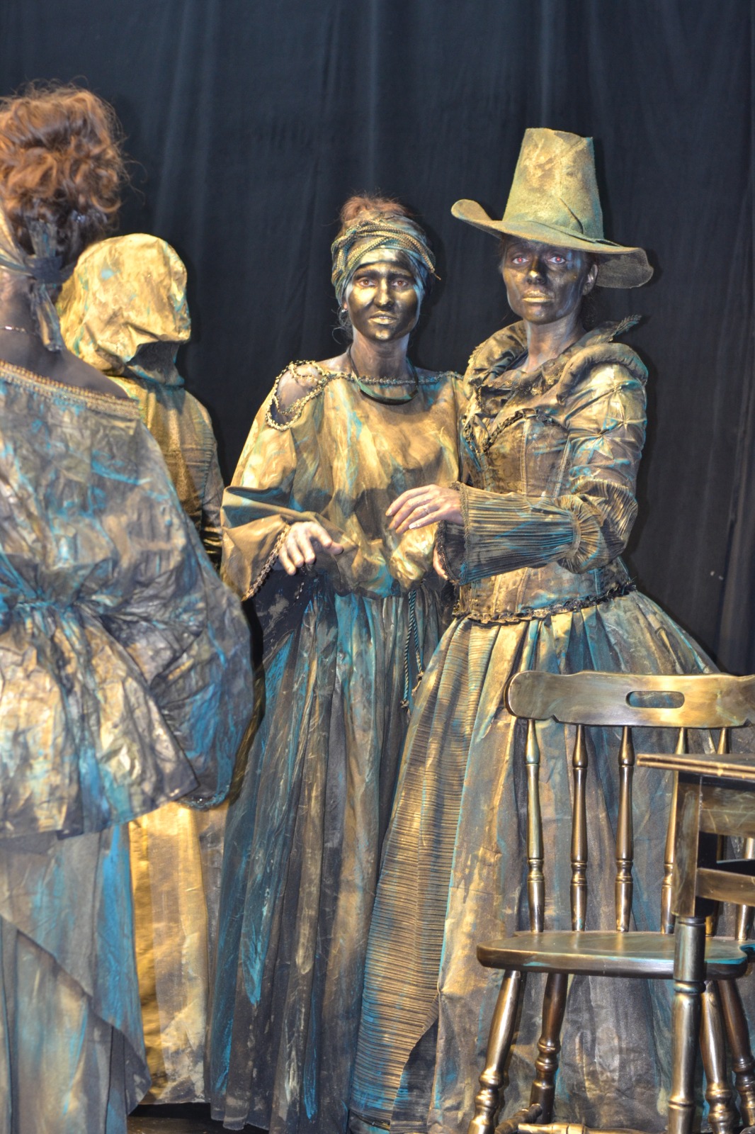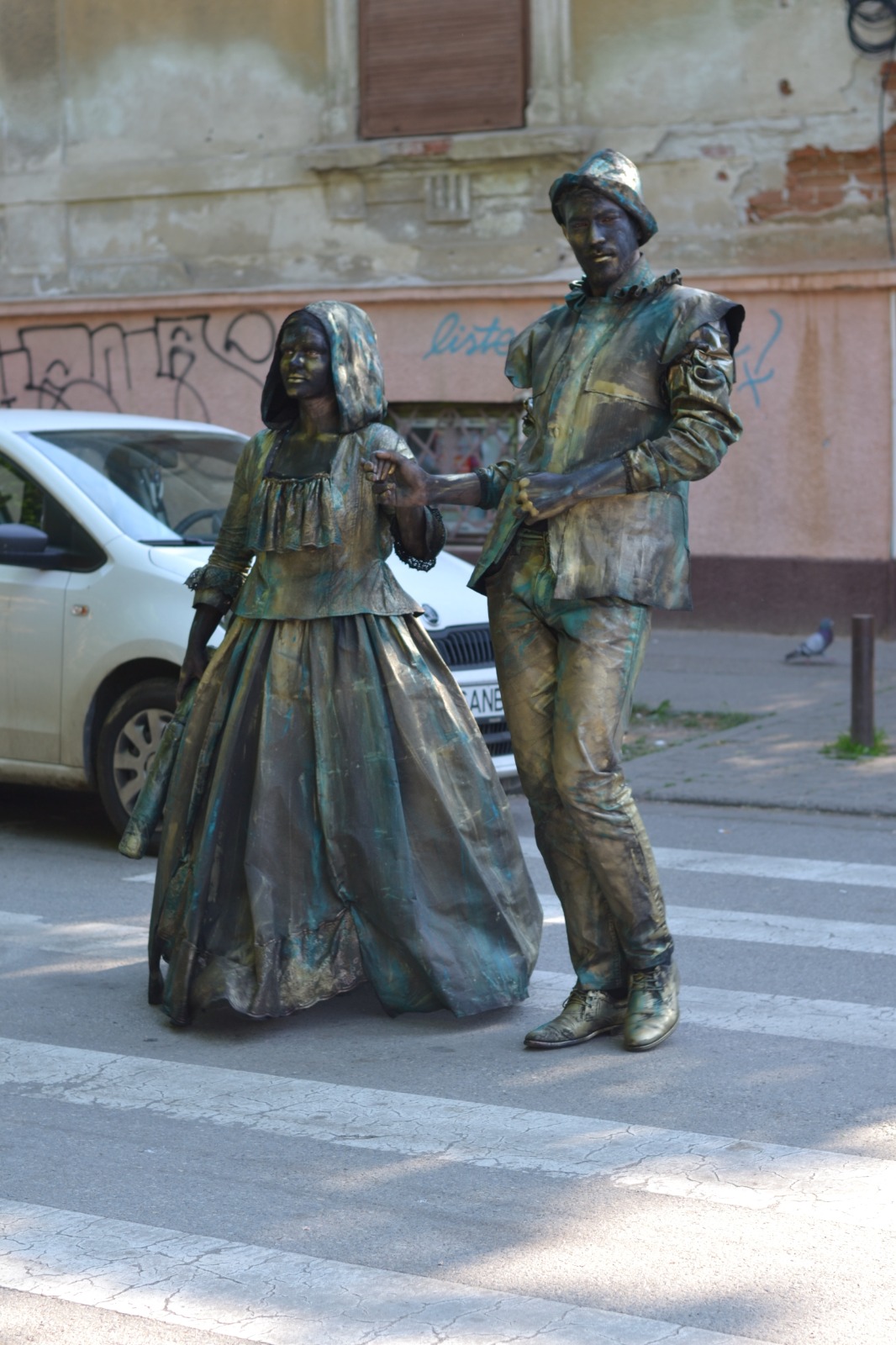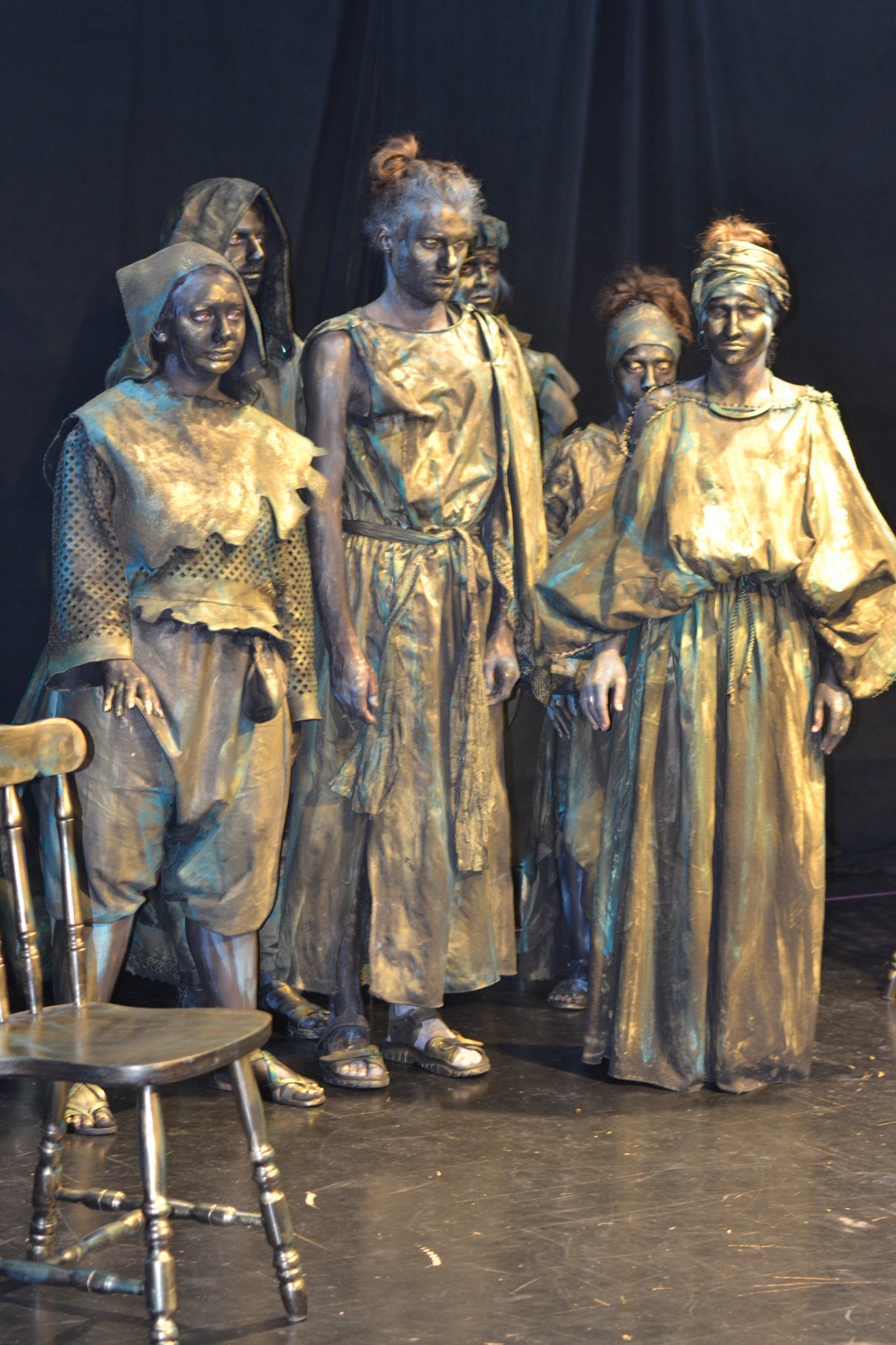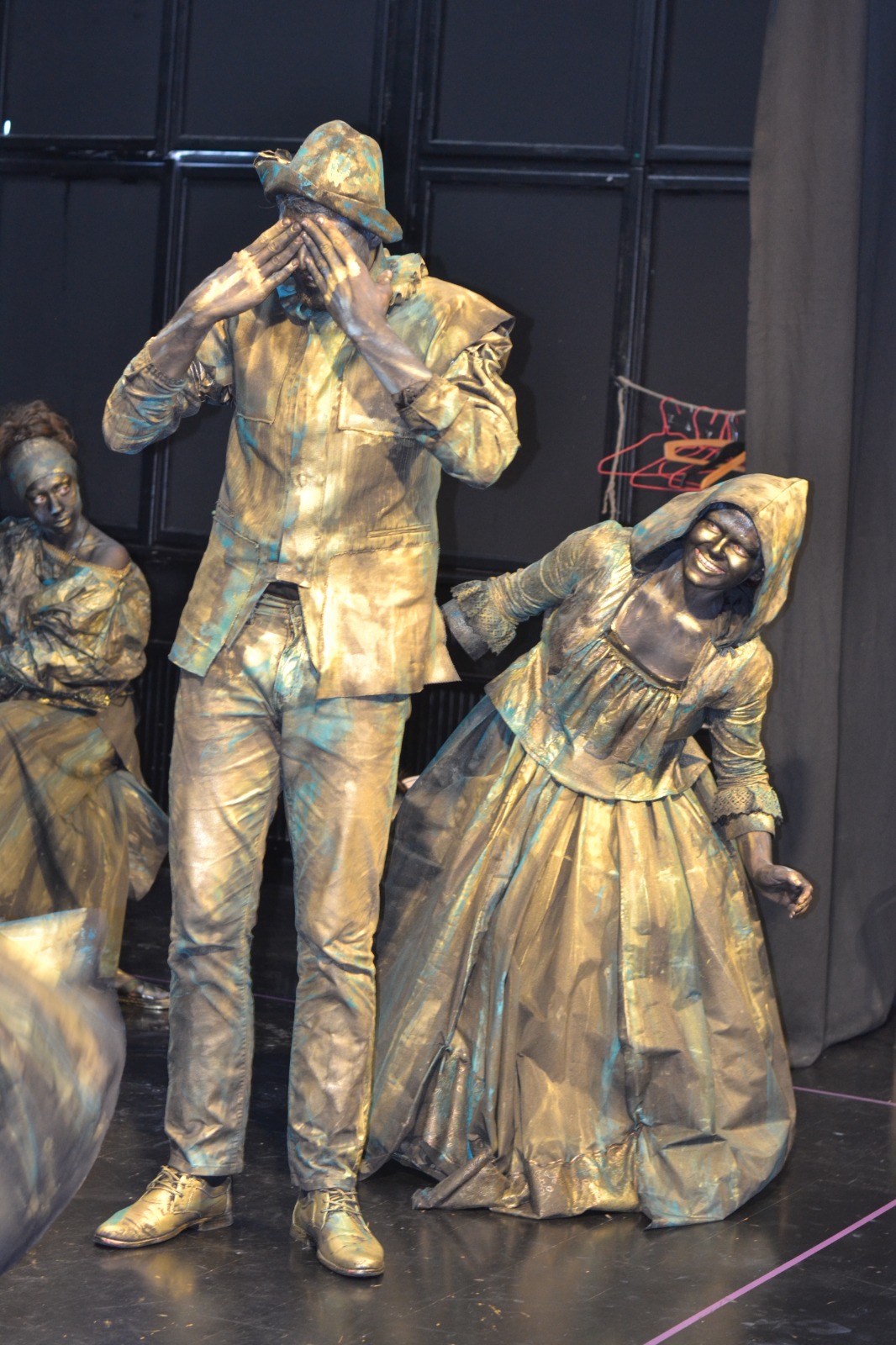 Am aplicat principiile artei sincretice, care este teatrul. Am folosit un spaţiu pe care l-am definit, inclusiv prin elemente de decor şi de recuzită. Am folosit o „poveste”. Muzica devine un „personaj” important în statuia vivantă care este o formă de discurs teatral nonverbal, discurs de mişcare. Sigur, pe de altă parte, respectăm legile nescrise ale statuii vivante: machiaj pe toată porţiunea de piele vizibilă, costume care definesc iluzia materialităţii pe care am ales-o aici (bronzul), fiecare statuie trebuie să „atârne” două-trei tone, ne mişcăm într-un anume fel, şi numai aşa.