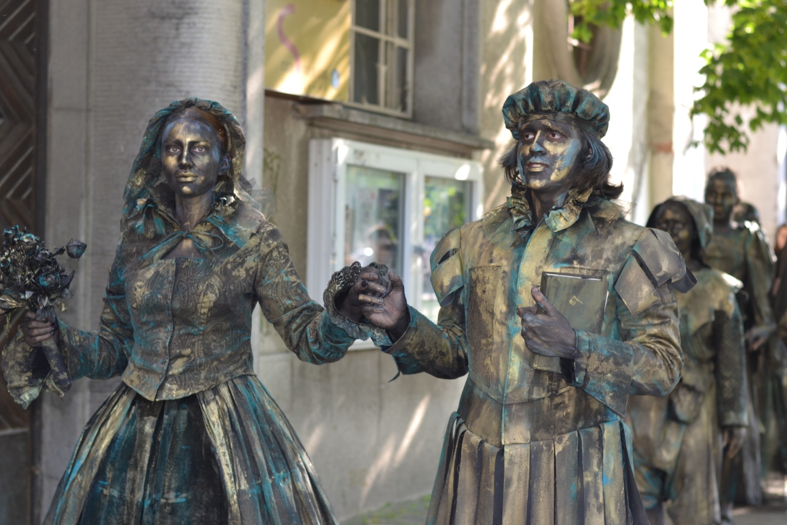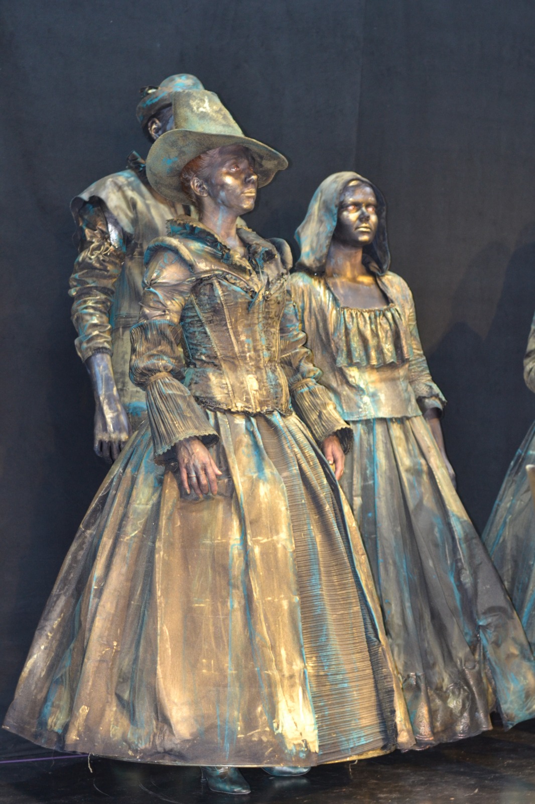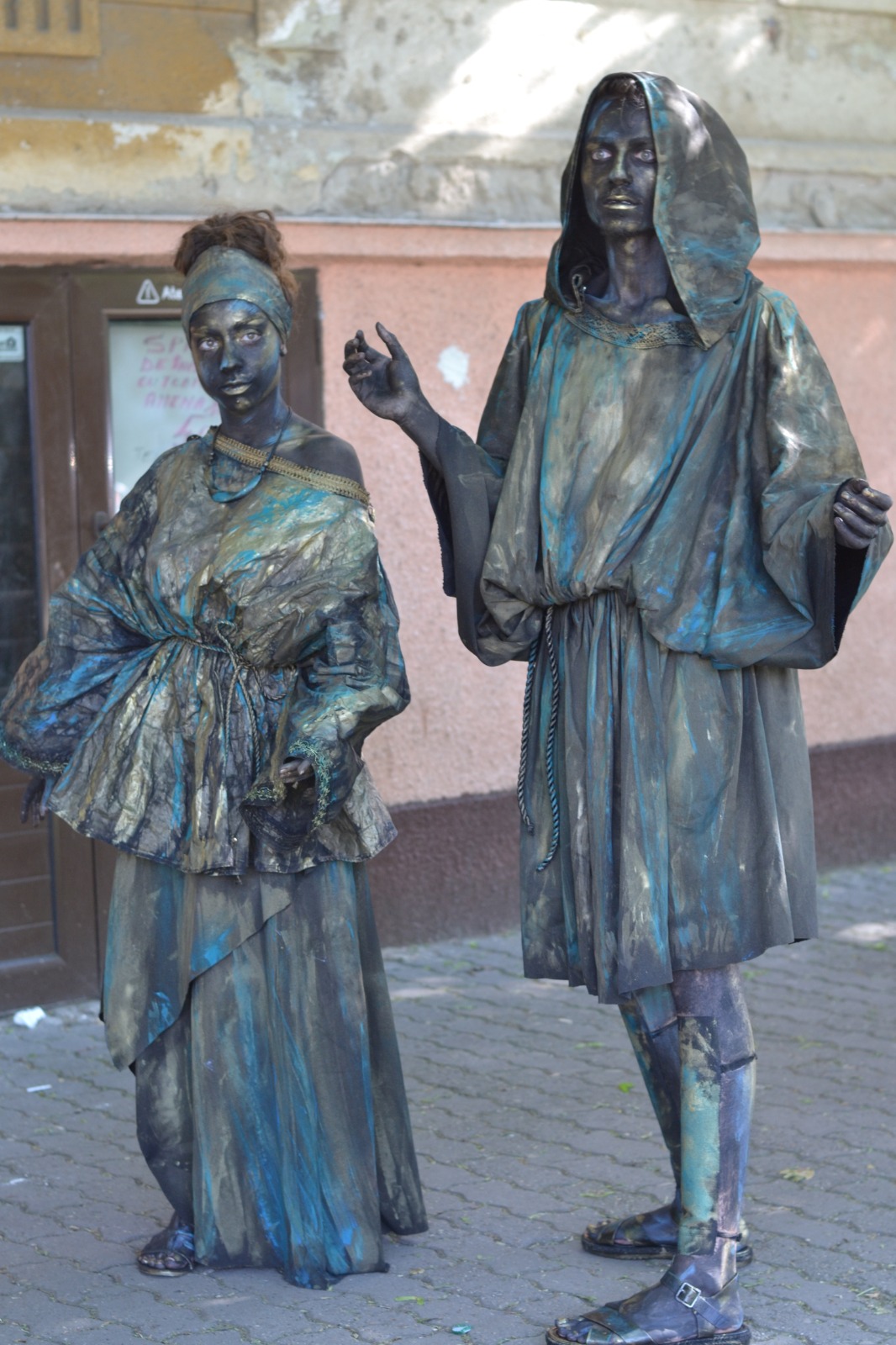 Am aplicat principiile artei sincretice, care este teatrul. Am folosit un spaţiu pe care l-am definit, inclusiv prin elemente de decor şi de recuzită. Am folosit o „poveste”. Muzica devine un „personaj” important în statuia vivantă care este o formă de discurs teatral nonverbal, discurs de mişcare. Sigur, pe de altă parte, respectăm legile nescrise ale statuii vivante: machiaj pe toată porţiunea de piele vizibilă, costume care definesc iluzia materialităţii pe care am ales-o aici (bronzul), fiecare statuie trebuie să „atârne” două-trei tone, ne mişcăm într-un anume fel, şi numai aşa.