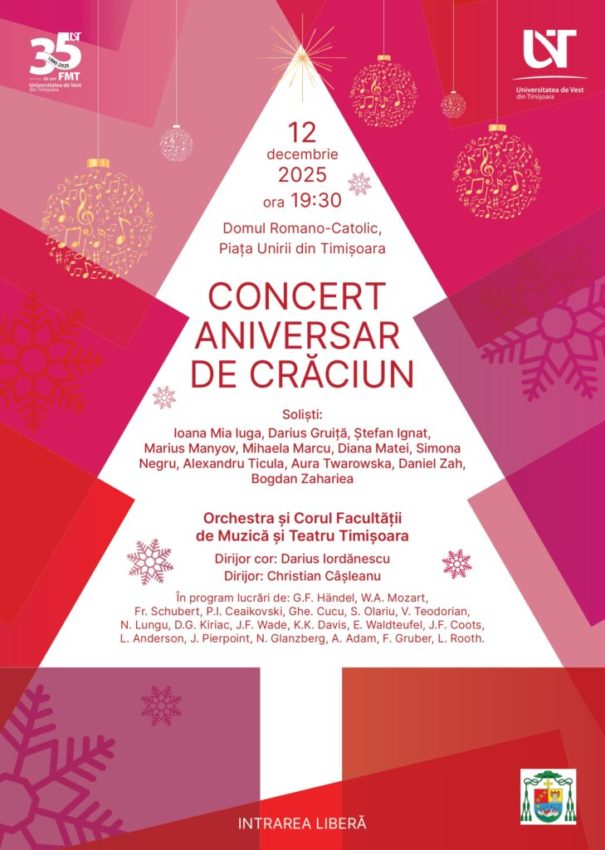 „Concertul Aniversar de Crăciun” va avea loc vineri, 12 decembrie 2025, începând cu ora 19:30, la Domul Romano-Catolic din Piața Unirii, Timișoara.