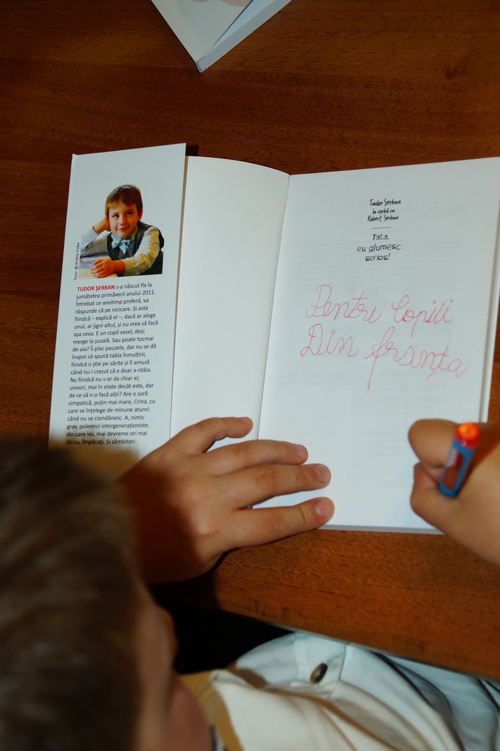 Tudor Șerban are cei 7 ani de acasă, și nu oricum, ci … cu umor. Atât de mult cât să lanseze prima lui carte chiar la această vârstă.  Asta și pentru că stând  ”la vorbă cu Robert Șerban” (tatăl adică, cu 18 cărți de beletristică la activ), cele mai involuntare și amuzante replici din ultimii (cinci!) ani au fost consemnate cu grijă.
