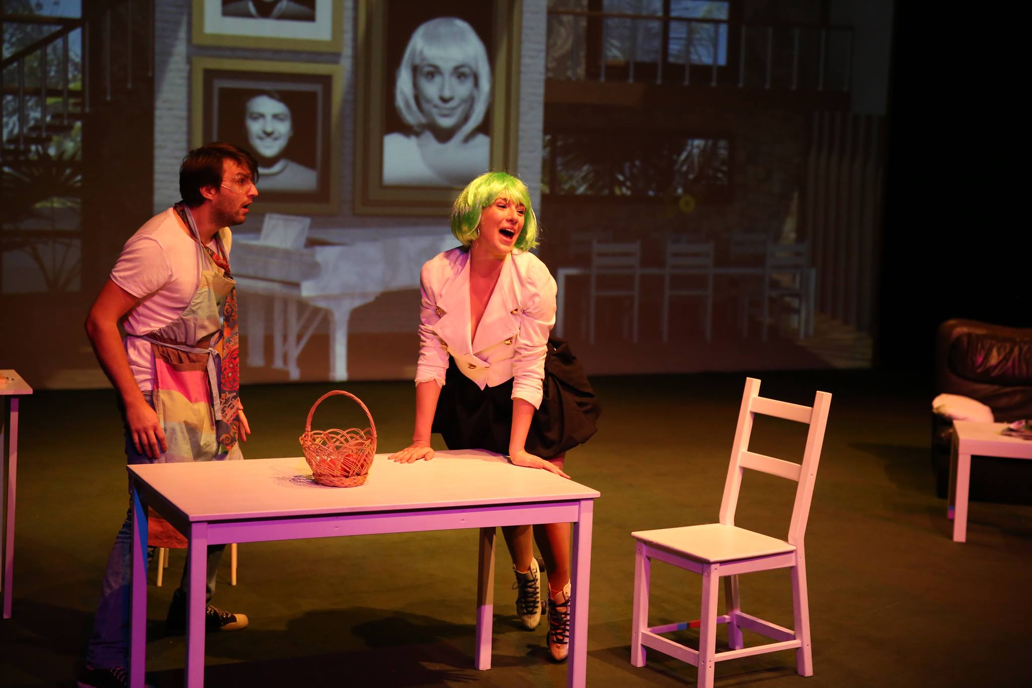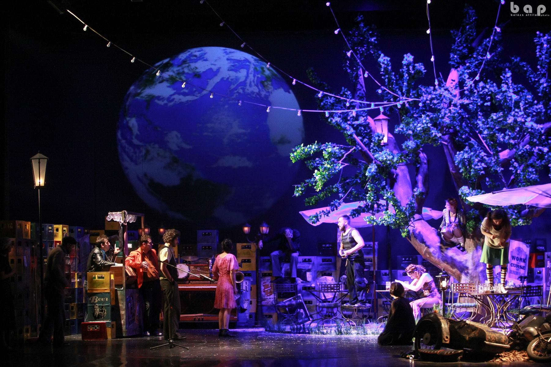 La prima vedere, în acest spectacol, lumea de după moarte nu diferă de viaţa de zi cu zi: ne aflăm într-o grădină de vară, cu scaune, mese, umbrele, cu un zid mare alcătuit din lăzi de bere. Totul pare a fi firesc, real şi, totuşi, din când în când, stranietatea se insinuează…
