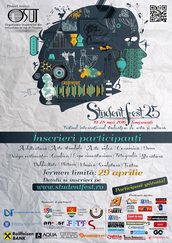 Tinerii care vor să își aprofundeze cunoștințele în domeniile propuse se pot înscrie ca participanți în cadrul secțiunilor festivalului până în data de 6 mai, completând formularul corespunzător pe site-ul www.studentfest.ro. De asemenea, pe site se găsesc mai multe detalii despre ateliere, secțiuni și festival. Totodată, amintim că înscrierile pentru artiști sunt încă deschise până la data de 20 aprilie 2016, timp în care se poate propune un concept lucrat individual sau în echipă, urmând ca în perioada festivalului să fie expus publicului larg.