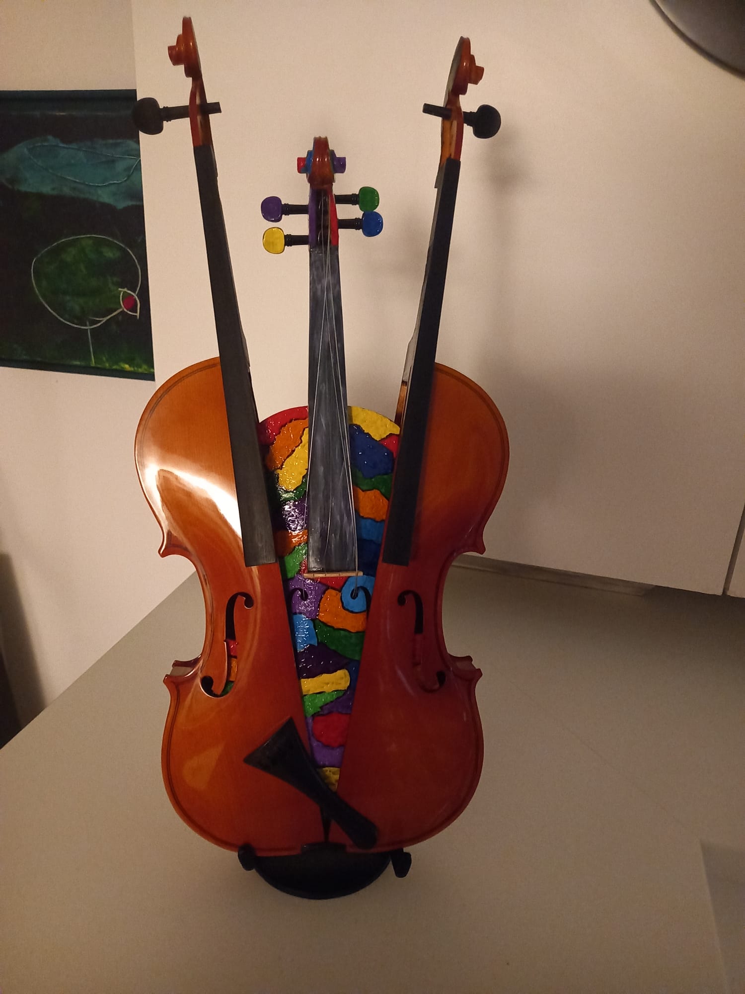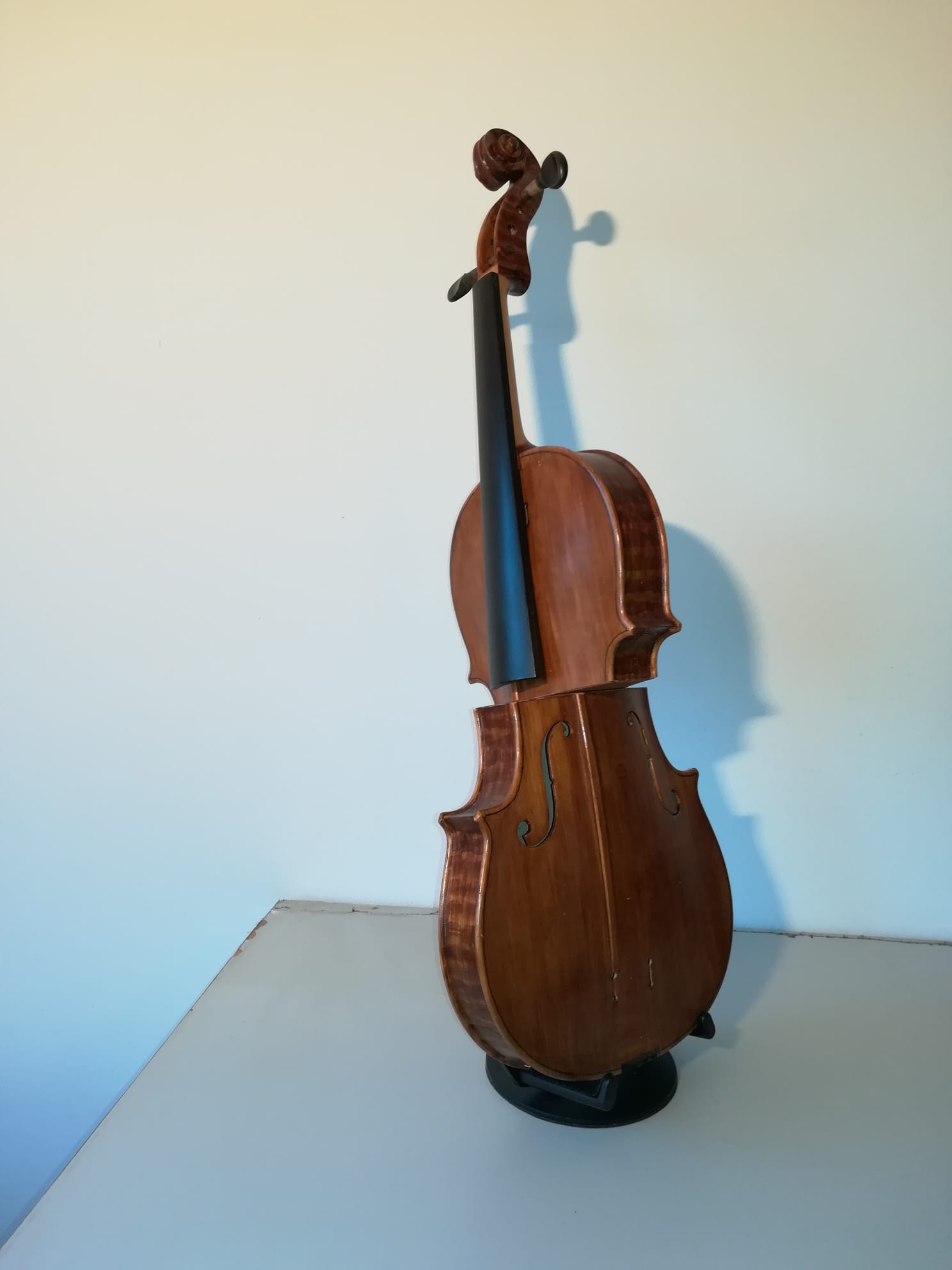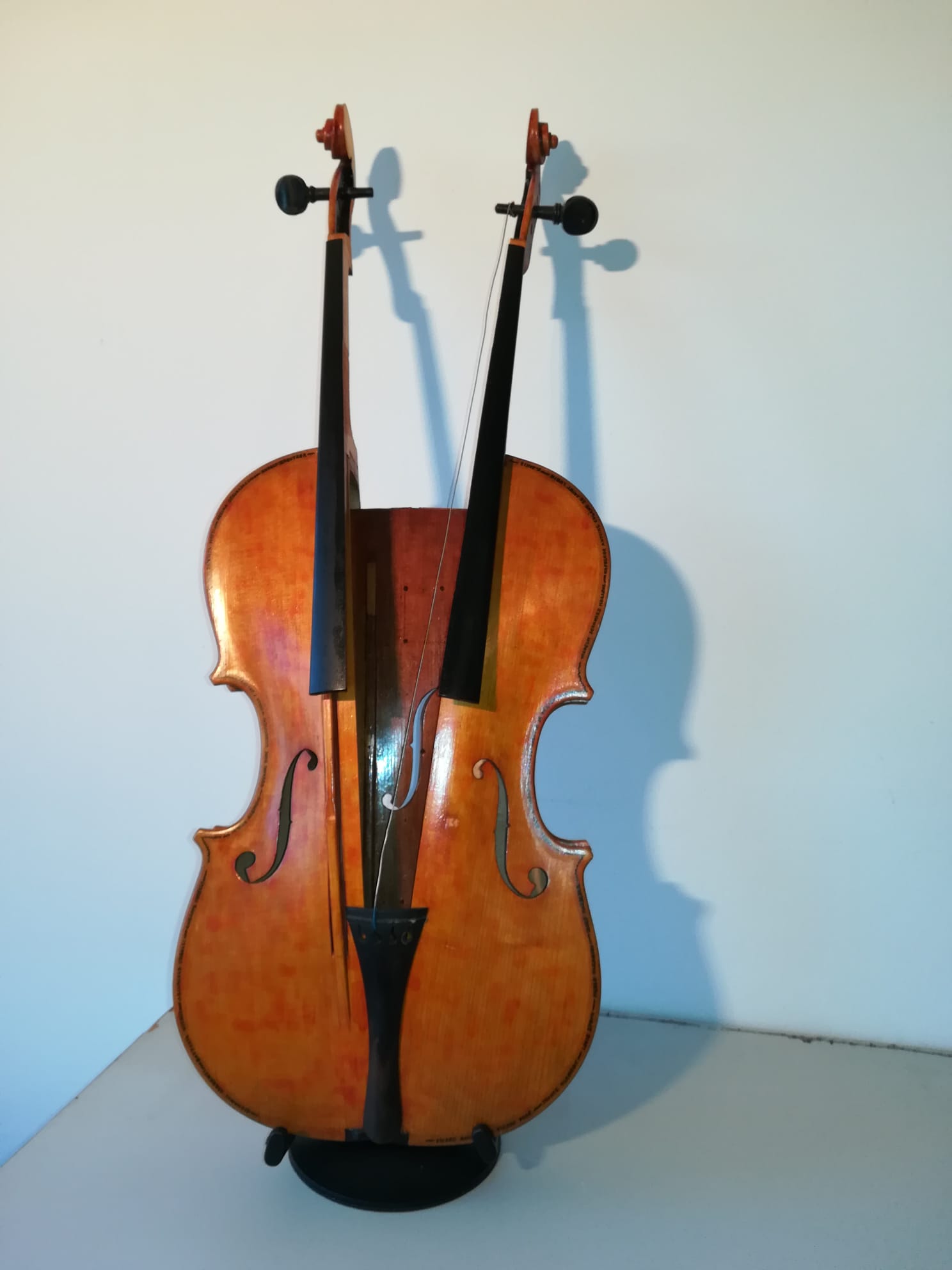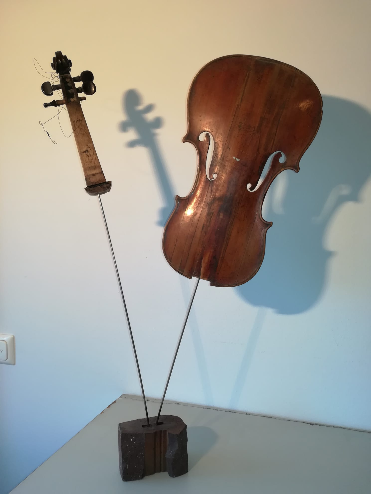 Cum spuneam, am cunoscut în Italia lucrările artistului plastic Arman, sculpturi de bronz care reprezintă instrumente de coarde descompuse. Așa mi-a venit ideea să descompun viorile neterminate ale tatălui meu și să le asamblez în mod divers. De la lemnul de vioară până la vioara întreagă, cu coarde, din care ieșeau sunete, tatăl meu a făcut absolut totul manual, chiar și călușii de vioară care trebuiau să fie adaptați viorii respective. Câteva viori au scăpat de soarta „descompunerii” și au rămas așa cum le-a lăsat tatăl meu. Pe una din ele a cântat un violonist dintr-un ansamblu din București. A cântat puțin “Méditation” din opera “Thaïs” de Jules Massenet și chiar au ieșit sunete bune. După mai bine de cinzeci de ani de tăcere totală, de atunci, pentru prima dată au ieșit sunete dintr-o vioară a tatălui meu.