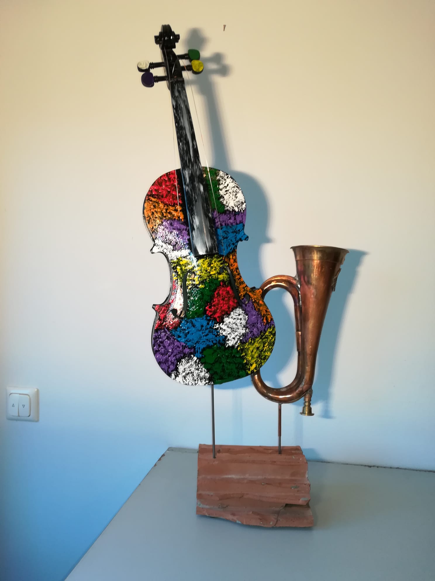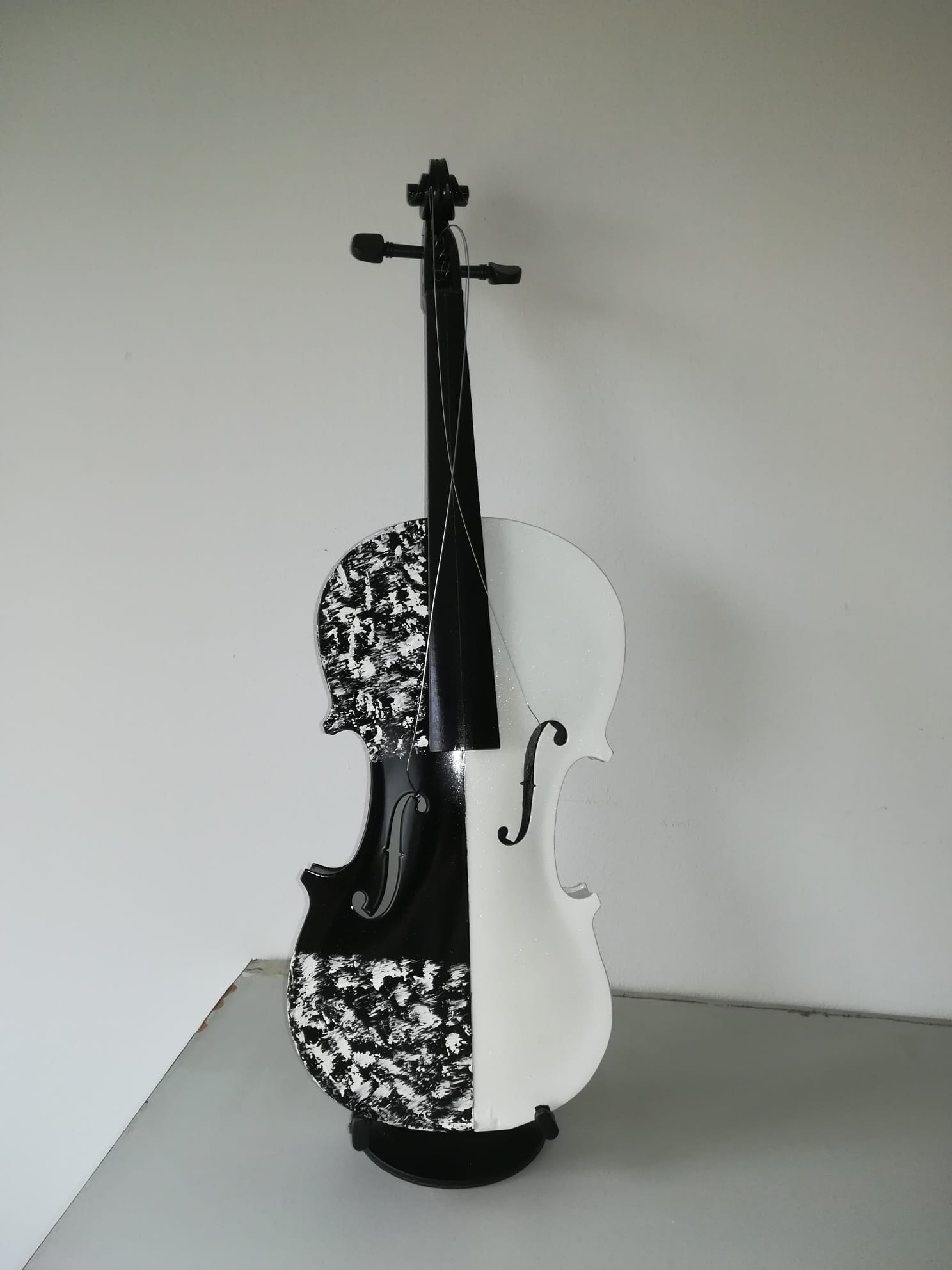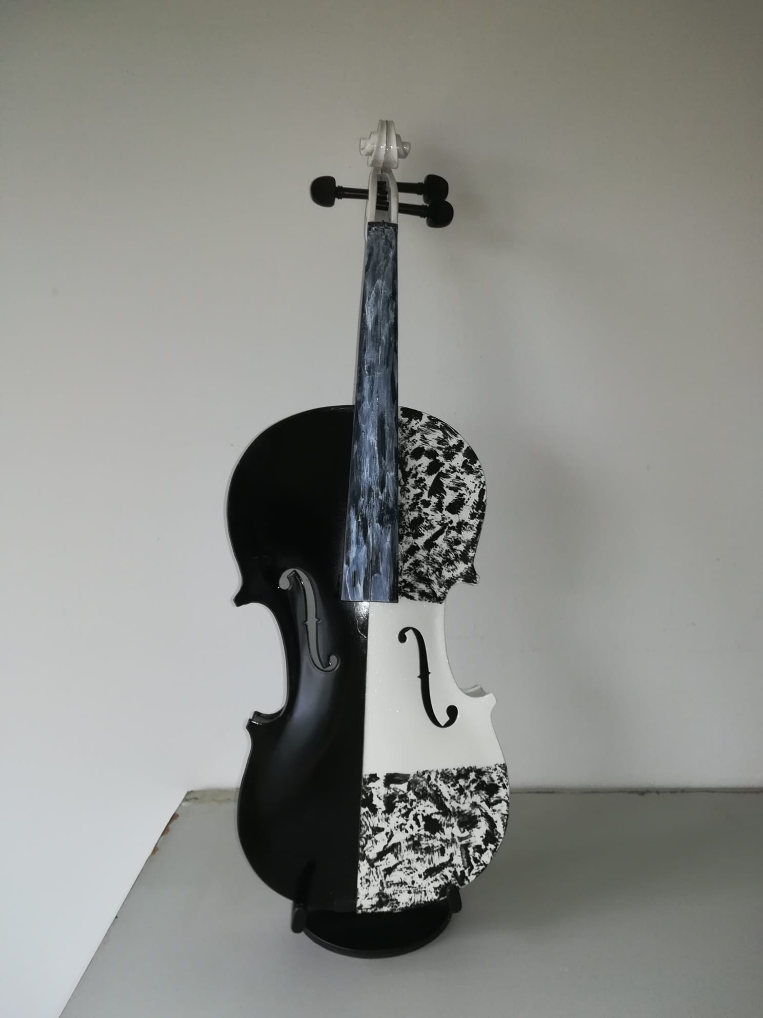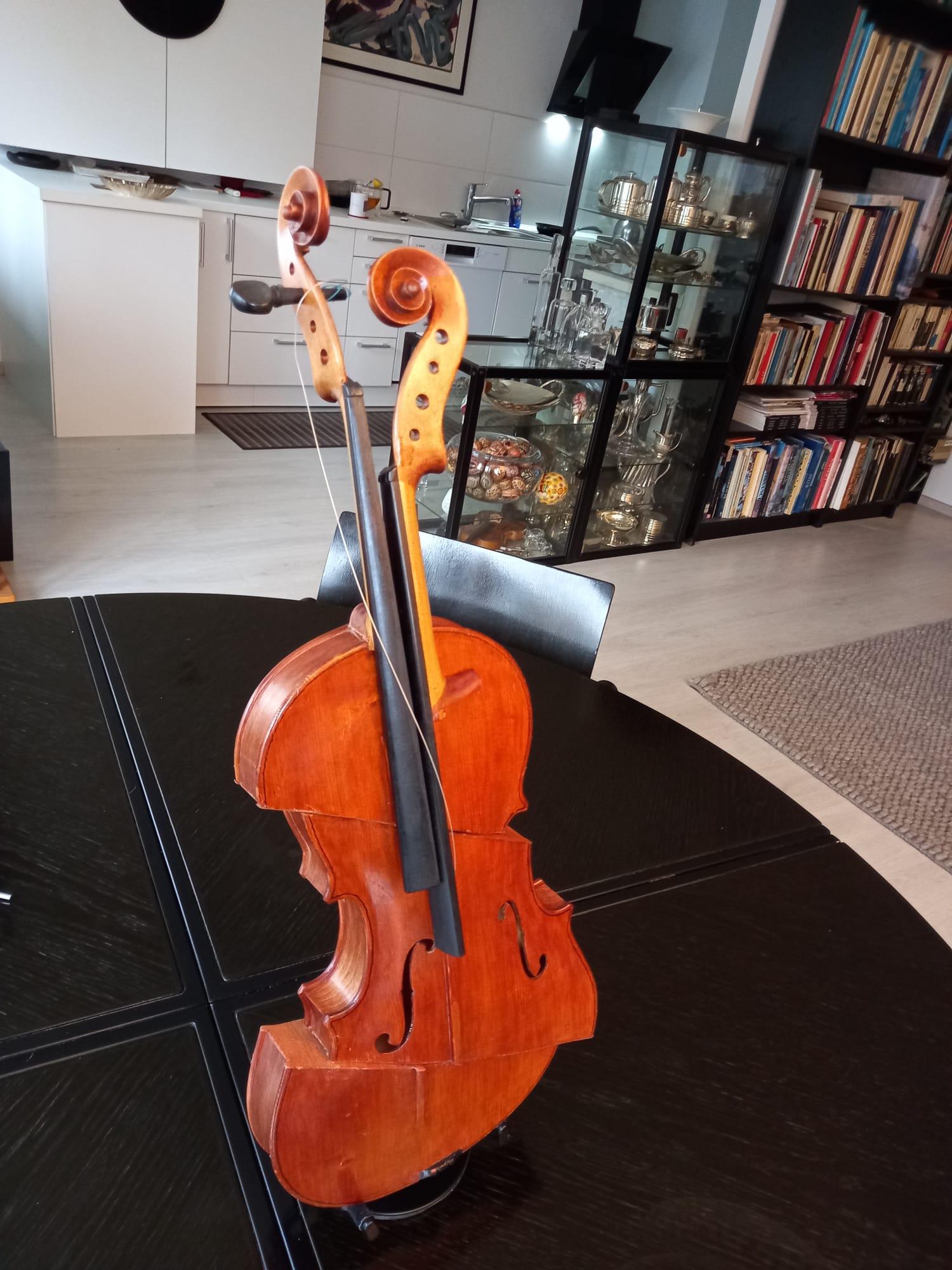 Cum spuneam, am cunoscut în Italia lucrările artistului plastic Arman, sculpturi de bronz care reprezintă instrumente de coarde descompuse. Așa mi-a venit ideea să descompun viorile neterminate ale tatălui meu și să le asamblez în mod divers. De la lemnul de vioară până la vioara întreagă, cu coarde, din care ieșeau sunete, tatăl meu a făcut absolut totul manual, chiar și călușii de vioară care trebuiau să fie adaptați viorii respective. Câteva viori au scăpat de soarta „descompunerii” și au rămas așa cum le-a lăsat tatăl meu. Pe una din ele a cântat un violonist dintr-un ansamblu din București. A cântat puțin “Méditation” din opera “Thaïs” de Jules Massenet și chiar au ieșit sunete bune. După mai bine de cinzeci de ani de tăcere totală, de atunci, pentru prima dată au ieșit sunete dintr-o vioară a tatălui meu.