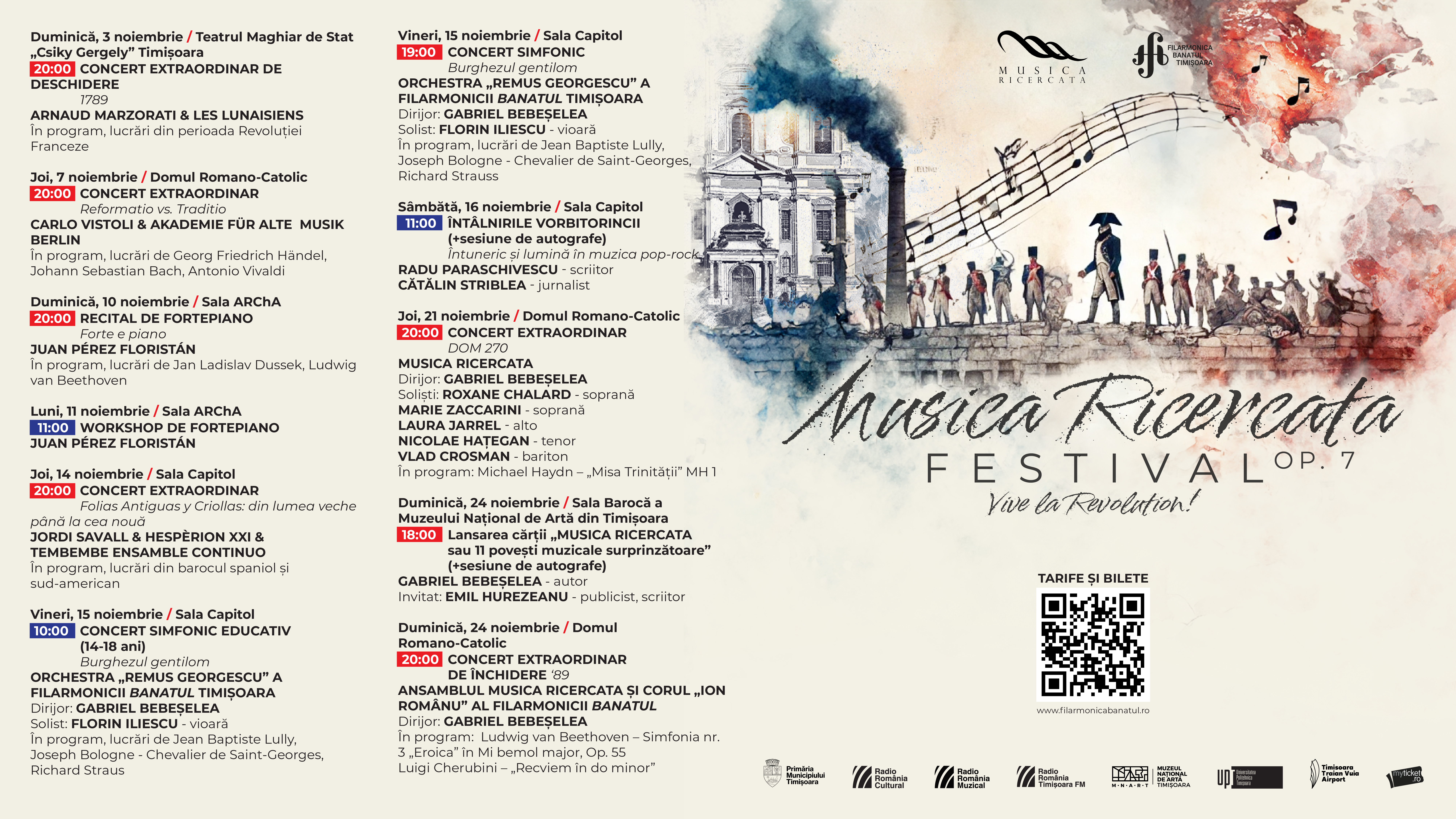 Musica Ricercata Festival Op. 7 | Vive la Révolution! aduce la Timișoara, în perioada 3 – 24 noiembrie 2024, artiști consacrați la nivel internațional, precum Arnaud Marzorati & Les Lunaisiens, Carlo Vistoli & Akademie Für Alte Musik Berlin, Jordi Savall & Hespèrion XXI & Tembembe Ensamble Continuo.