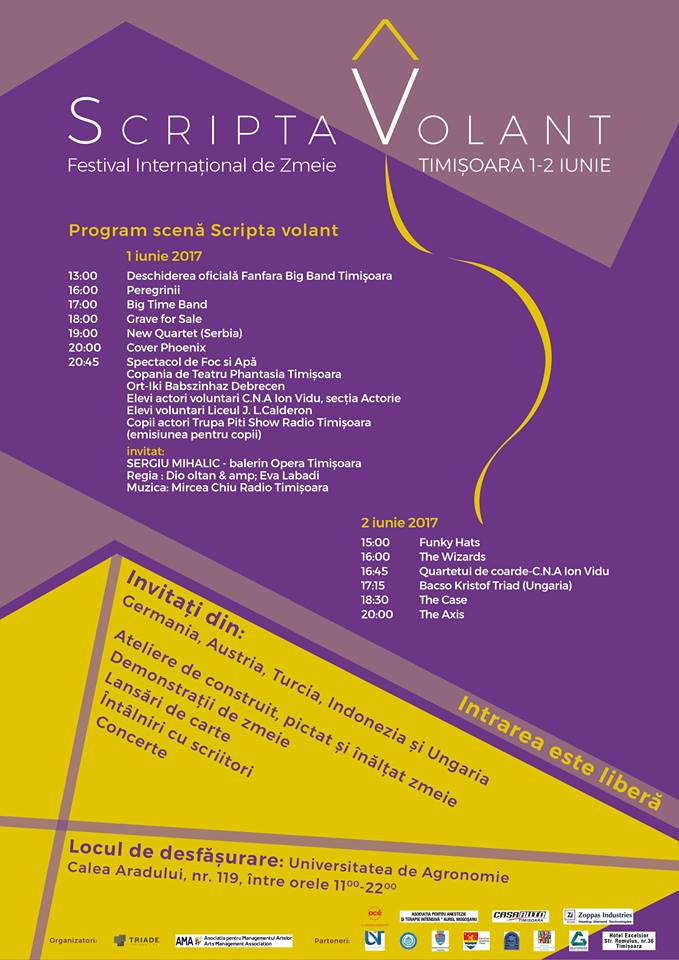 Festivalul Internațional de Zmeie, Literatură, Muzică şi Arte Plastice ”Scripta volant” se află la prima ediție și continuă la Universitatea de Ştiinţe Agricole şi Medicină Veterinară a Banatului și în 2 iunie. Reunește participanţi din România, Germania, Austria, Turcia şi Ungaria. Programul zilei de 1 iunie a inclus și lansarea volumului care a dat numele festivalului: „Scripta volant – O enciclopedie a zmeielor”, de Şerban Foarță. În cele două zile ale festivalului sunt demonstrații ale mânuitorilor de zmeie, concertează 12 formaţii, iar programul mai cuprinde ateliere pentru copii de scriere creativă, construcție şi design de zmeie, jocuri şi muzică cu tema zborului, dezbateri științifice privind sursele de energie alternativă şi lansări de cărţi şi reviste.