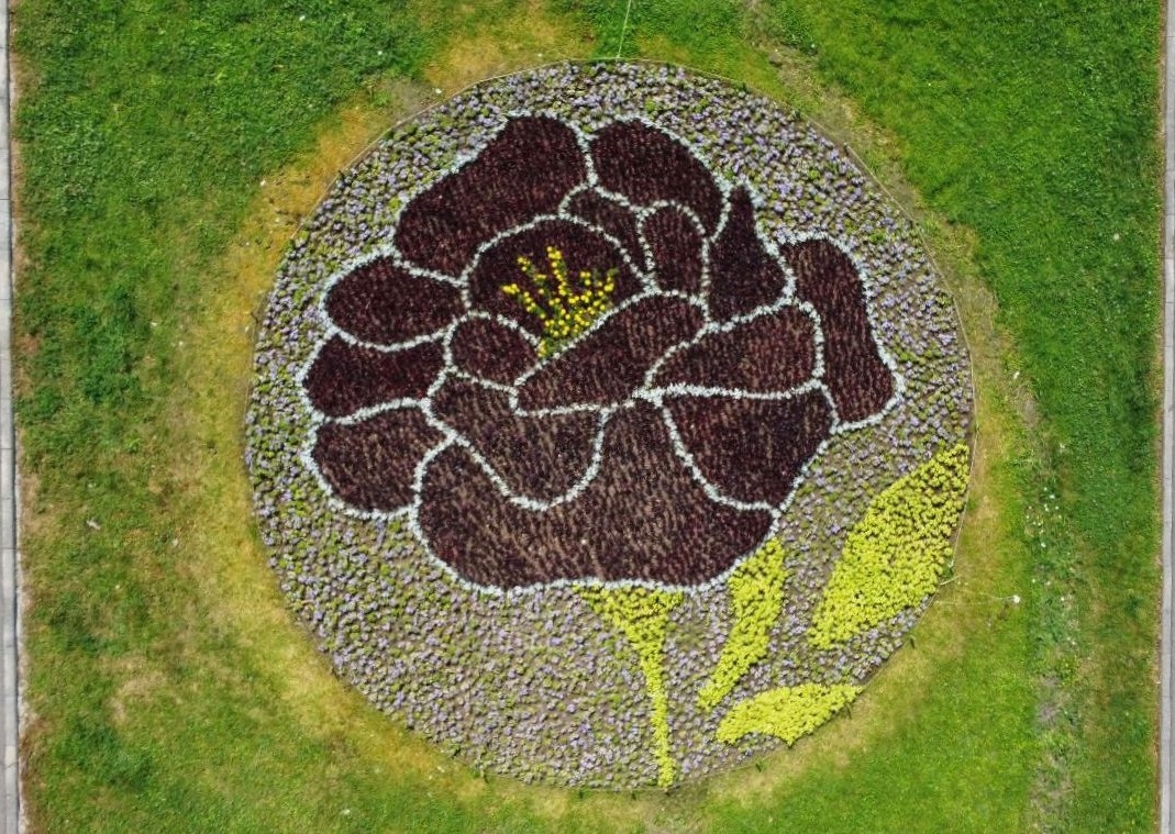 Sute de flori formează un bujor, floarea națională, în Parcul Botanic din Timișoara. Aranjamentul a fost realizat de echipele Horticultura, la intrarea dinspre bulevardul Gheorghe Dima și Parcul Alpinet.