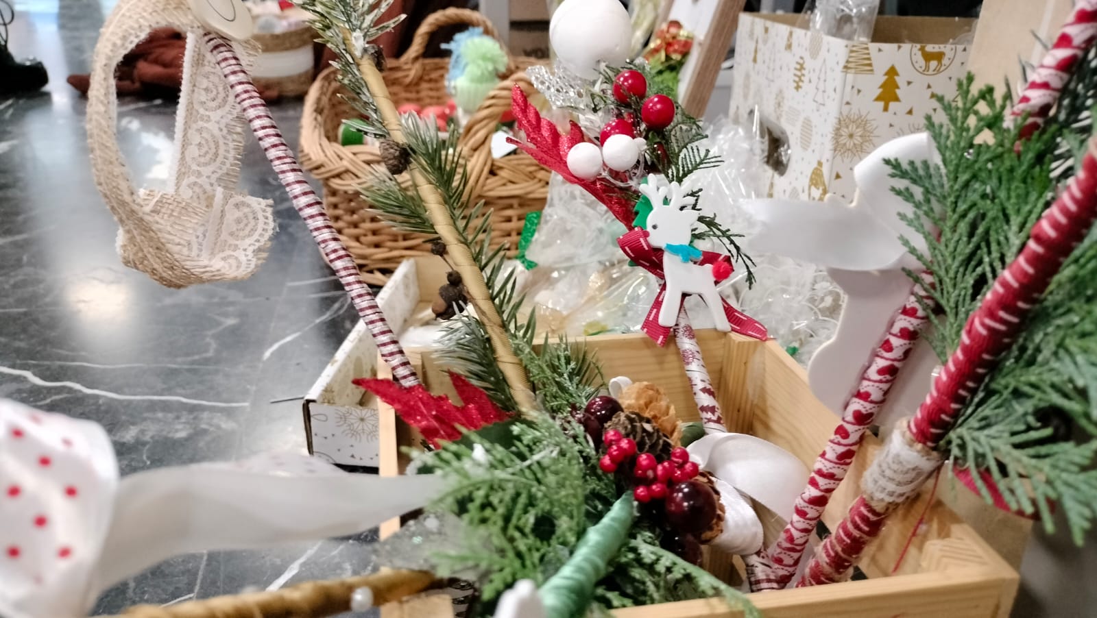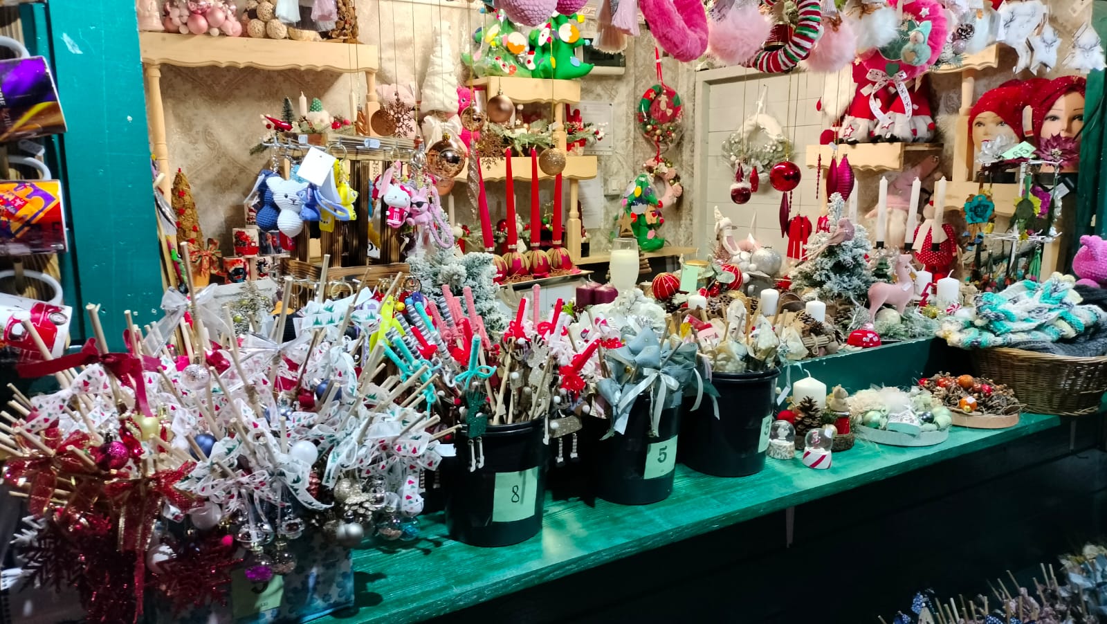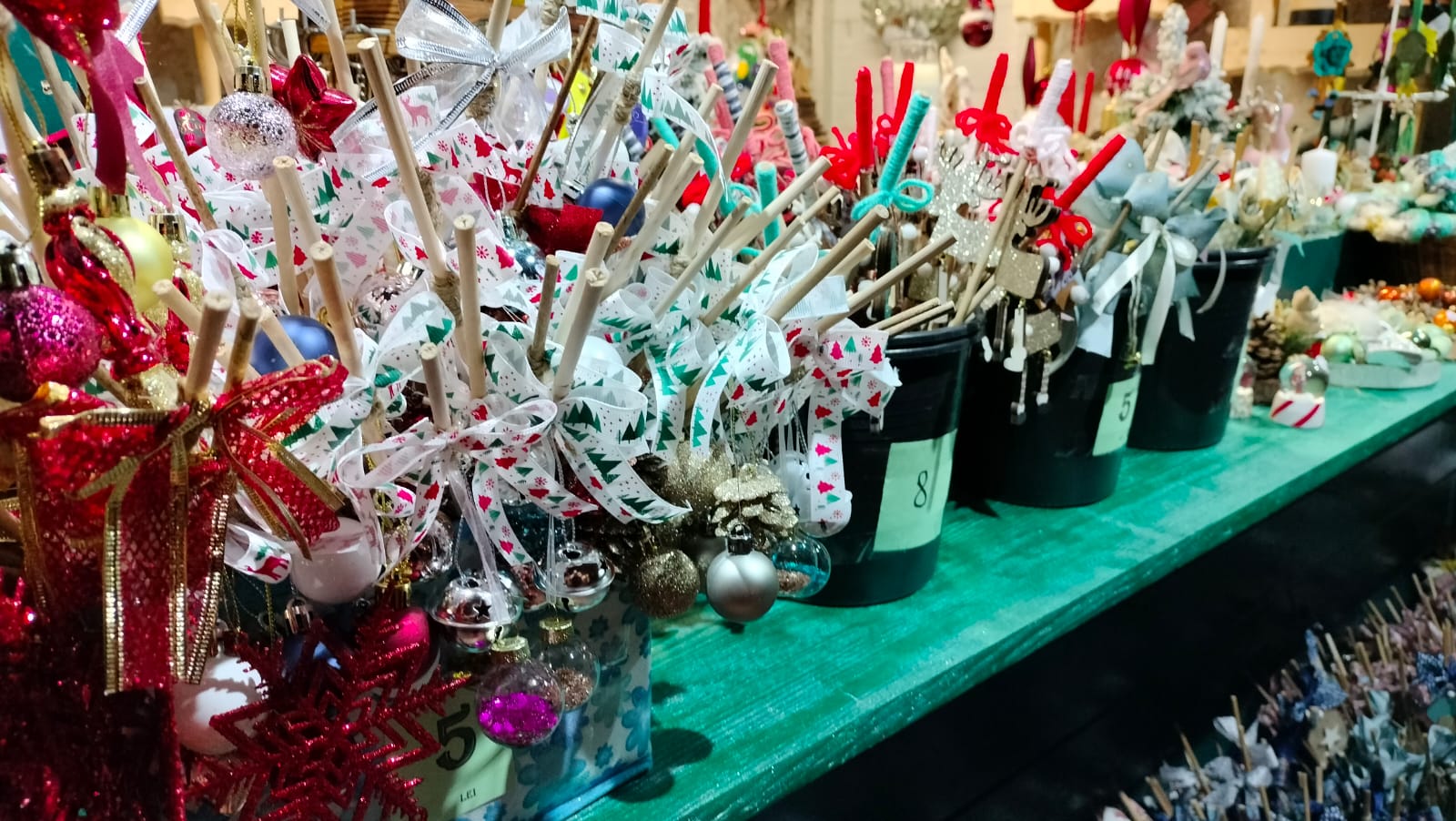 “Noi ne-am pregătit, ca în fiecare an, cu o multitudine de bețe pentru copii cuminți și necuminți. Le-am accesorizat, mai bine spus. Bețele sunt din bambus, papură. Ele vor fi refolosite, în sensul că pot fi un sprijin pentru flori, iar figurinele atașate pot fi agățate ulterior în brad, la fel și fontele, alte accesorii care constituie bățul. E grea alegerea din multitudinea de modele, asta și încercăm să facem, să nu mergem doar pe un singur tipar și am ales de la jucării de pluș, forme de steluțe umplute, jucării din lemn, conuri împodobite, tot felul de simboluri care reprezintă până la urmă Crăciunul”, spune Violeta.