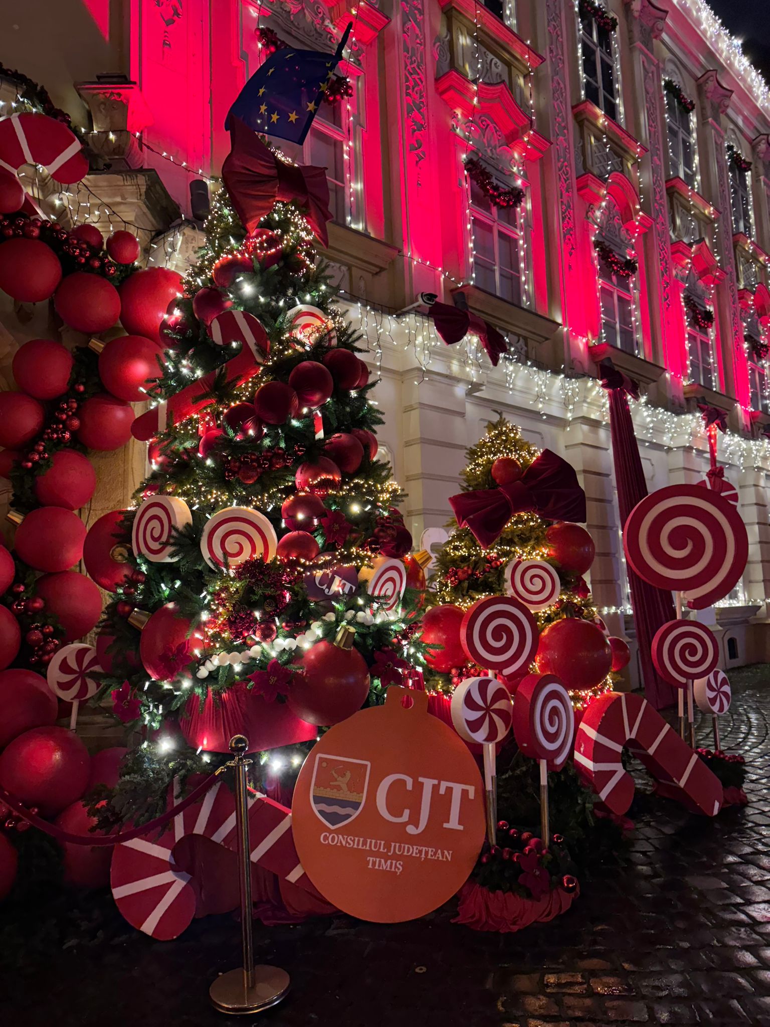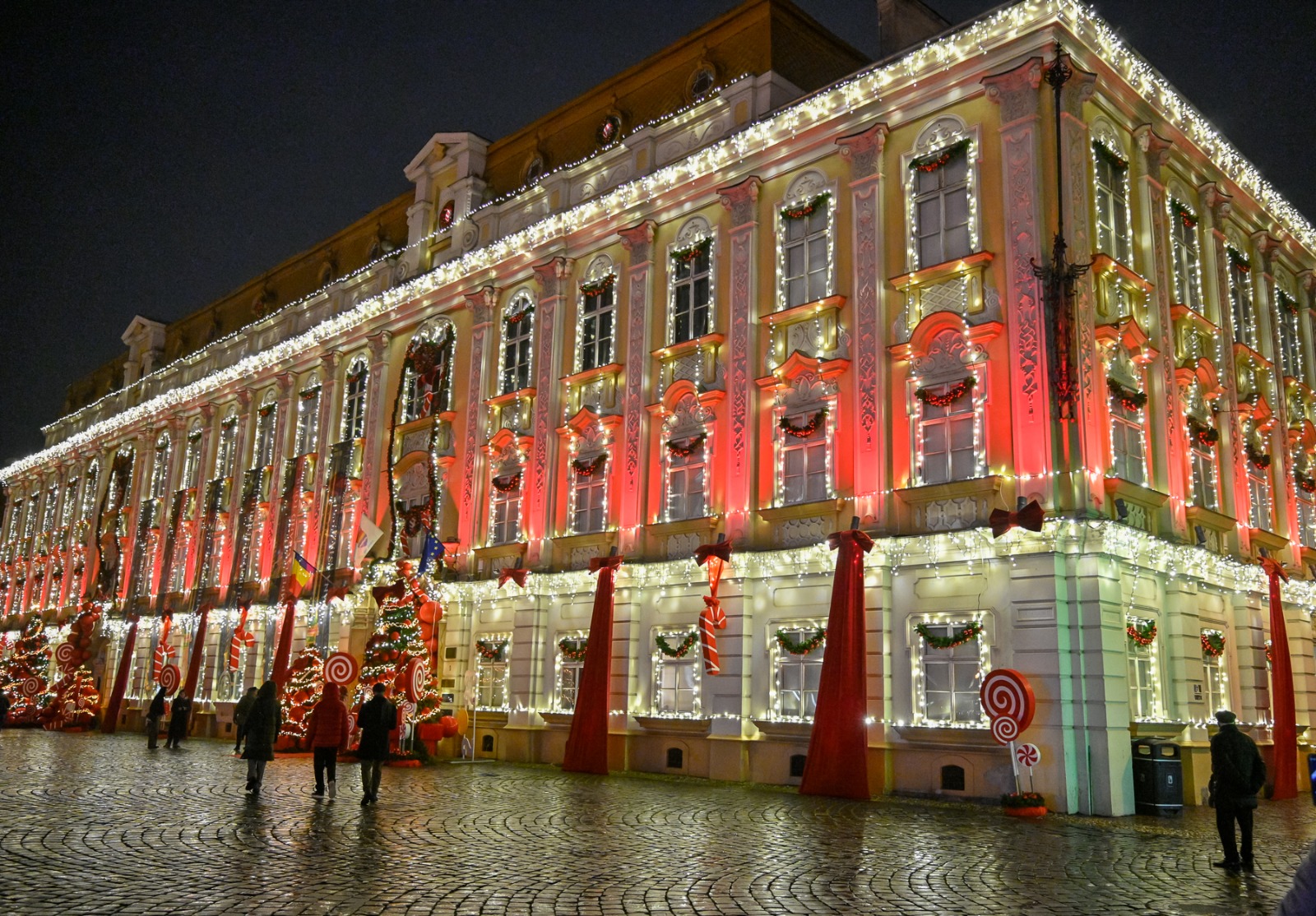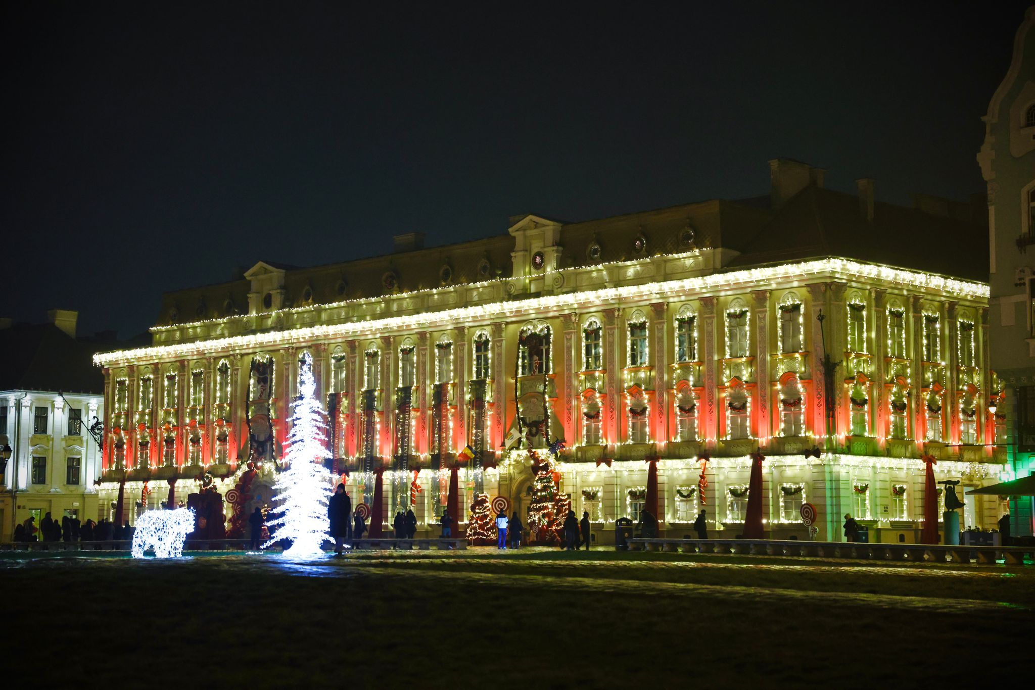 Palatul Baroc din Piața Unirii, una dintre cele mai elegante clădiri ale Timișoarei și sediul Muzeului Național de Artă, și-a schimbat complet înfățișarea odată cu aprinderea iluminatului festiv pregătit de Consiliul Județean Timiș.