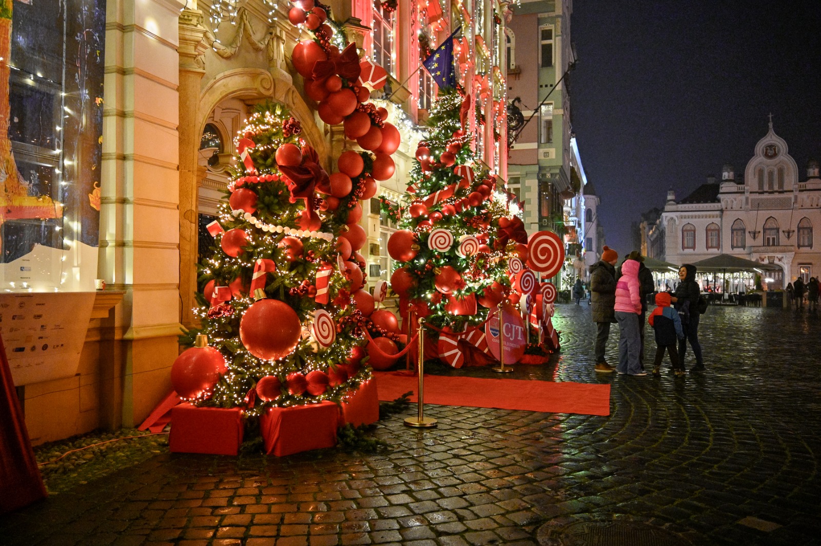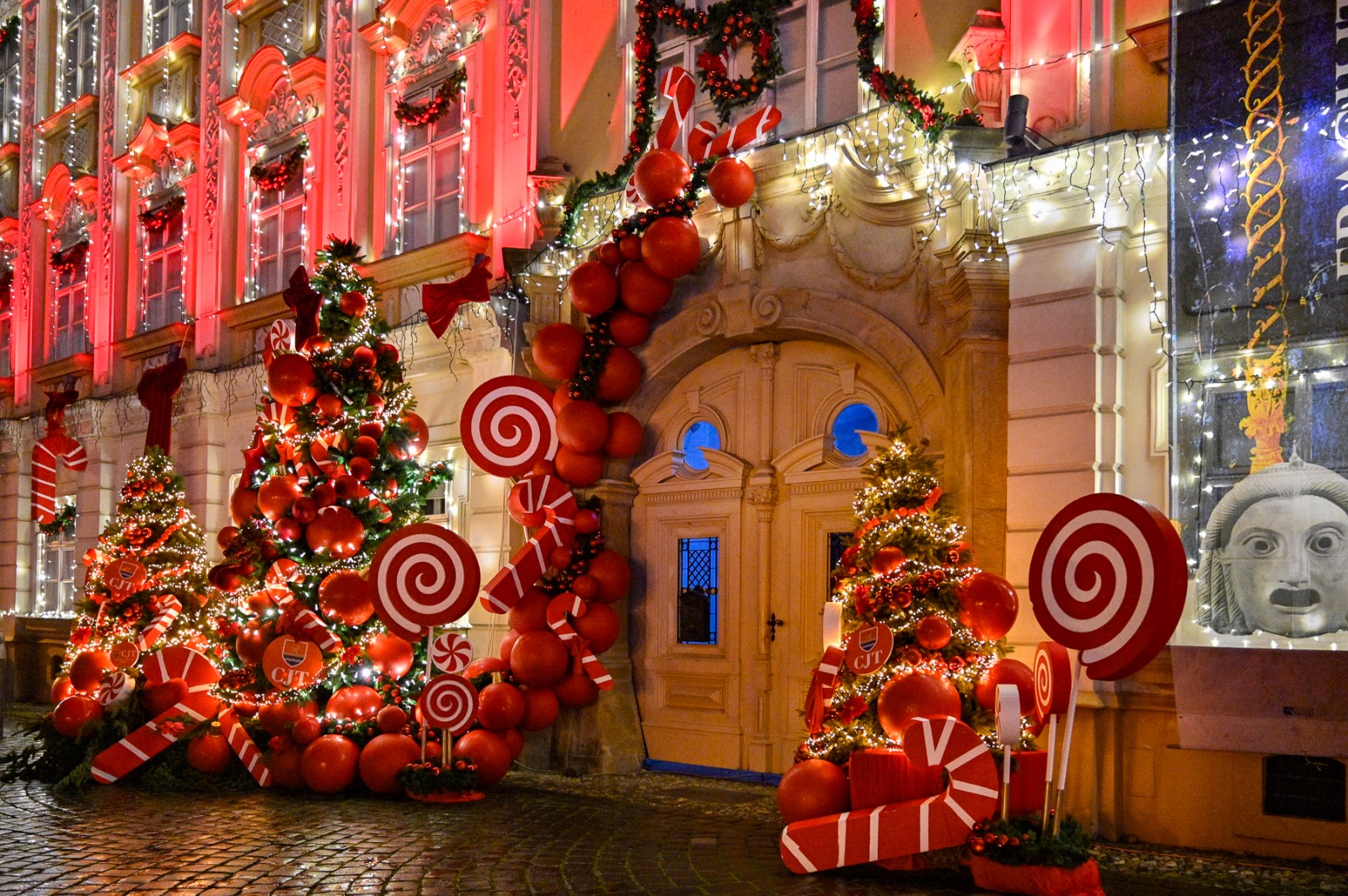 Fațadele palatului au fost decorate cu instalații luminoase și elemente vizuale specifice sărbătorilor de iarnă.