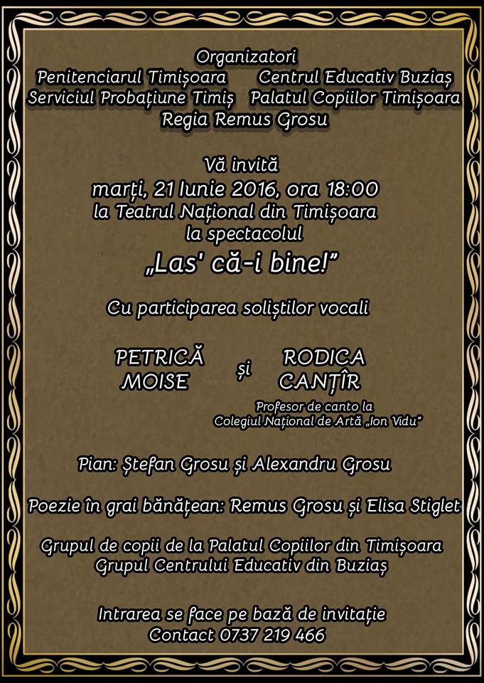 Primul spectacol a avut loc la Casa de Cultură din Buziaș, iar cel de-al treilea este programat pentru marţi, 28 iunie, de la ora 21:00, în cadrul Penitenciarului Timișoara, cu participarea naistului Nicolae Voiculeț.