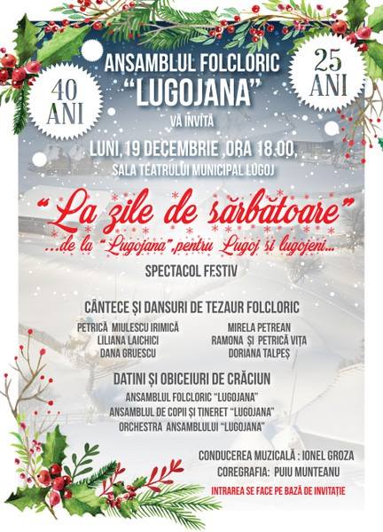 Lugojenii îmbracă straie de sărbătoare alături de Ansamblul folcloric reprezentativ „Lugojana”, care pregăteşte un spectacol festiv ce cuprinde cântece şi dansuri de tezaur folcloric, datini şi obiceiuri de Crăciun.