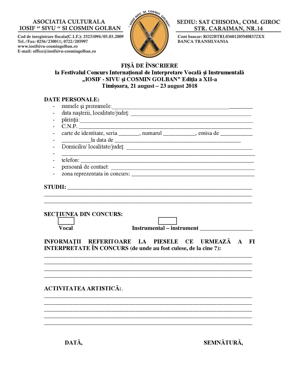 Au început înscrierile pentru Festivalul-Concurs „Iosif Sivu şi Cosmin Golban” / FIȘA DE ÎNSCRIERE