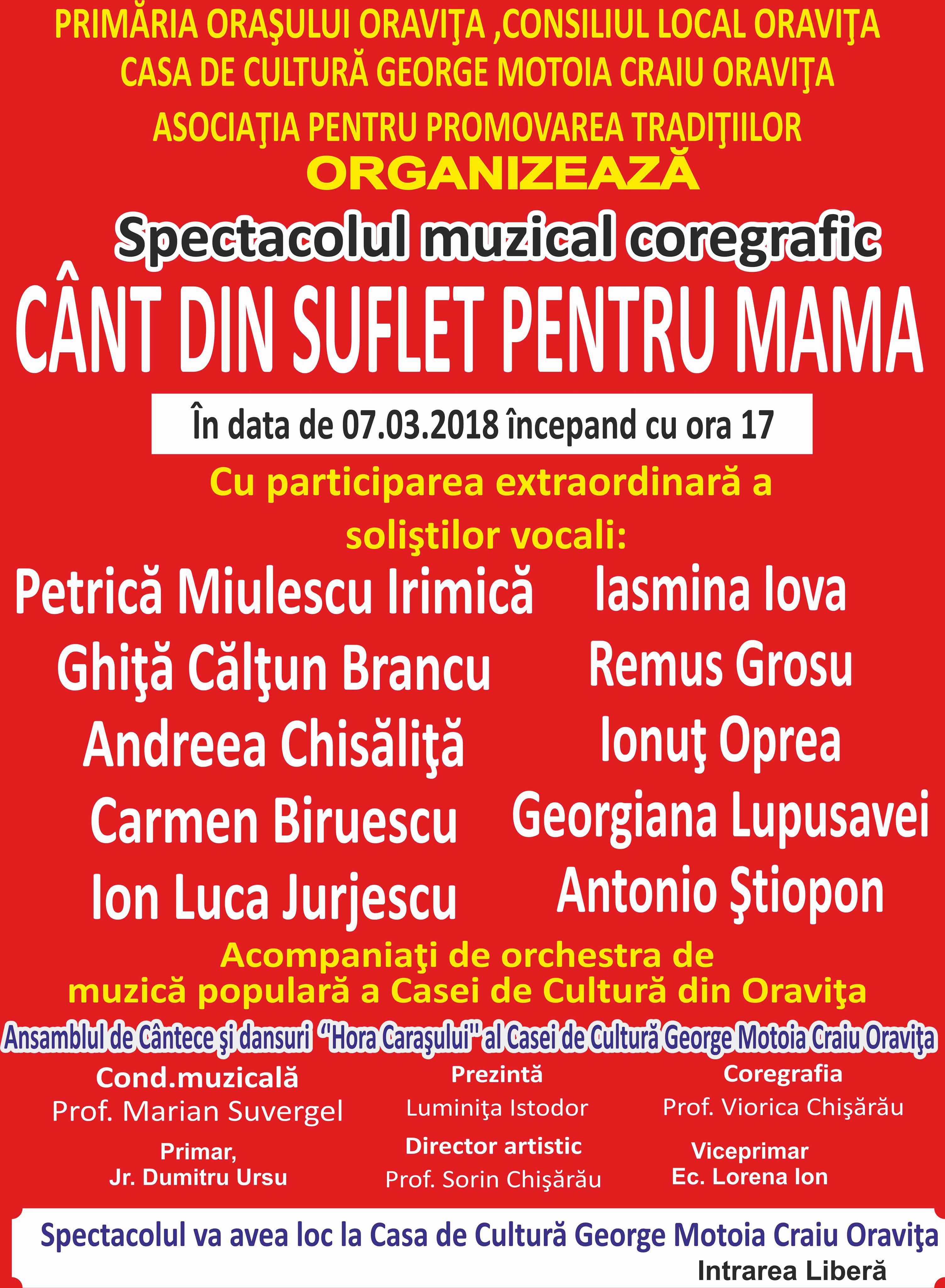 Spectacolul muzical-coregrafic „Cânt din suflet pentru mama” va avea loc miercuri, 7 martie, de la ora 17:00.