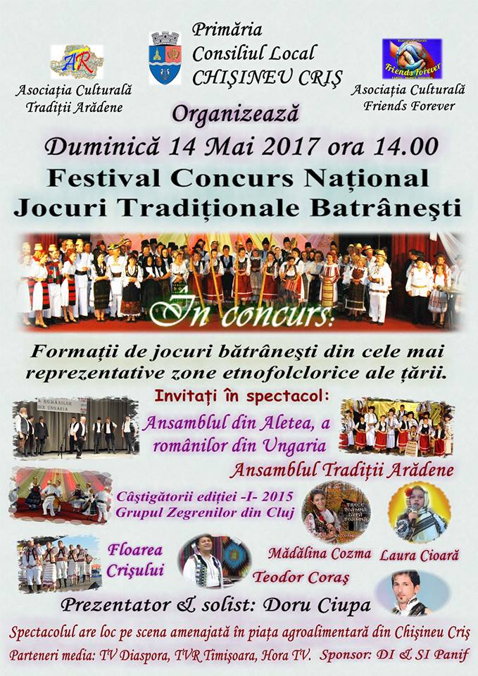 Duminică 14 mai, la ora 11: 00, Casa de Cultură din Chişineu Criş va avea loc Simpozionul cu tema ,,Jocul tradiţional din vatra satului –unitate în diversitate”. La ora 13:30 se va desfăşura parada portului popular.