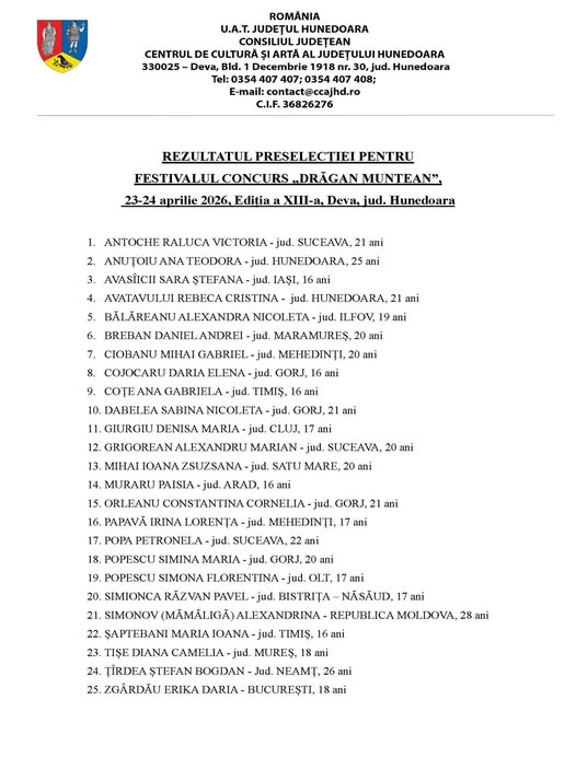 Lista concurenților admiși în urma preselecției Festivalului „Drăgan Muntean”