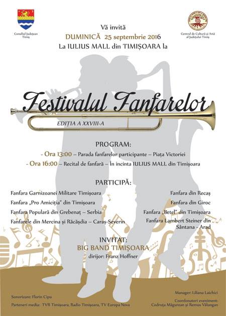 În ultima duminică a lunii septembrie, timişorenii vor putea urmări 9 formaţii din judeţele Timiş, Caraş-Severin, Arad şi din Banatul Sârbesc: Fanfara Garnizoanei Militare Timişoara, Fanfara “Pro amiciţia” din Timişoara, Fanfara Populară din Grebenaţ – Serbia, Fanfarele din Mercina şi Răcăşdia – Caraş Severin, Fanfara din Recaş, Fanfara din Giroc, Fanfara “Betel” din Timişoara şi Fanfara “Lambert Steiner” din Sântana – Arad.