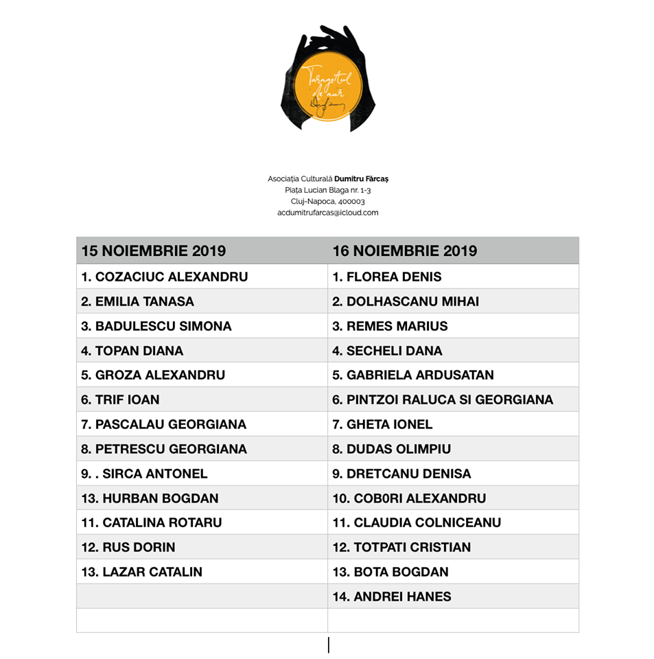 Astăzi, vor evolua următorii 14 concurenţi selectaţi în urmă cu o lună de juriul prezidat de Prof. univ. dr. Vasile Jucan, Rectorul Academiei Naţionale de Muzică “Gheorghe Dima” din Cluj – Napoca.
