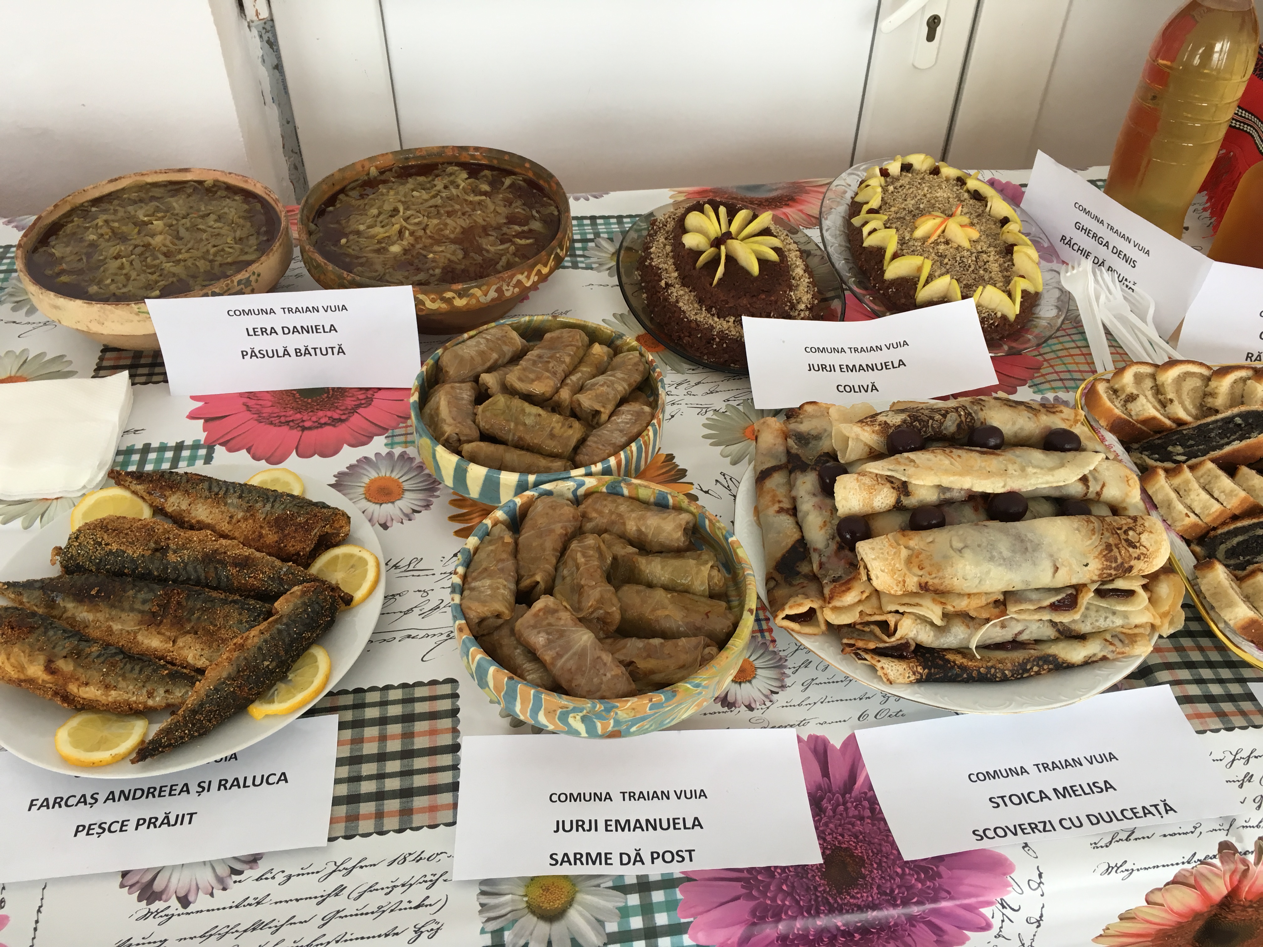 Sarmale de post, colivă, păsulă bătută, steluţe cu brânză, crovne, plăcintă cu mac şi nucă, scoverzi cu dulceaţă, răchie de prună, au pregătit locuitori ai comunei Traian Vuia: Emauela Jurji, Daniela Lera, Raluca Farcaş, Maria Todirică, Melisa Stoica, Sonia Olariu, Denis Gheju, Răzvan Olariu şi Brutăria Sudriaş şi alţii.