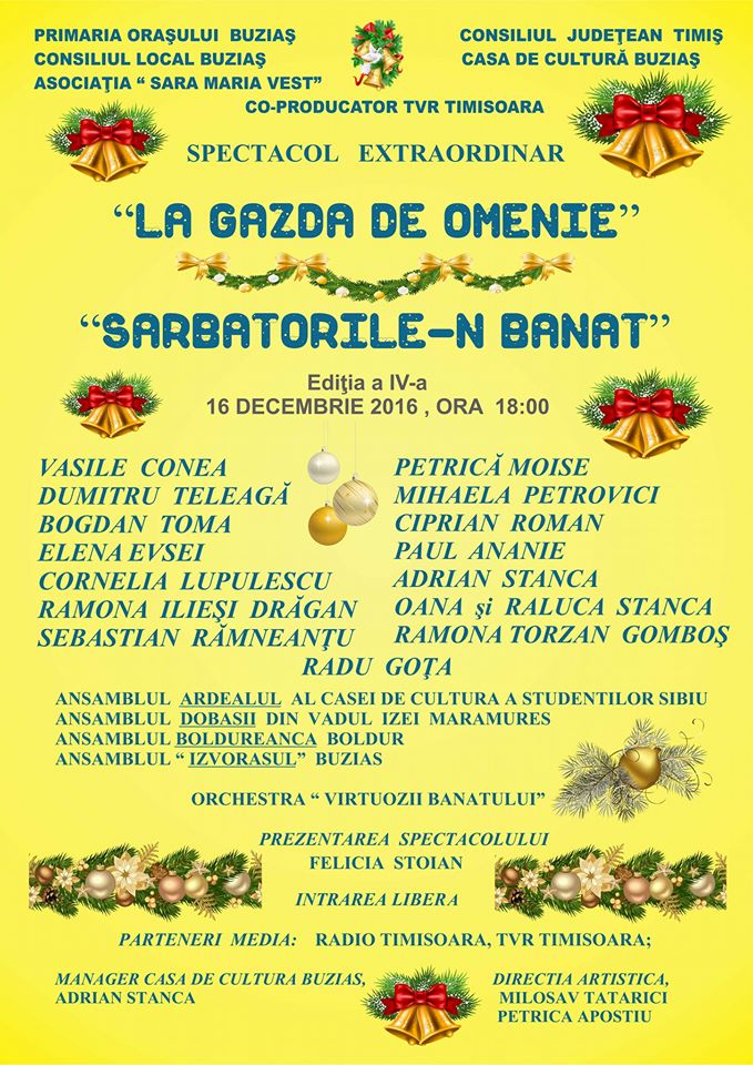 Grupuri artistice din Sibiu, Vadul Izei –Maramureş şi Buldur – Timiş, “Virtuozii Banatului”, interpreţi îndrăgiţi din Banat şi Ardeal participă la cea patra ediţie a spectacolului organizat de Casa de Cultură din Buziaş cu sprijinul Primăriei şi Consiliului Local Buziaş şi al Consiliului Judeţean Timiş.