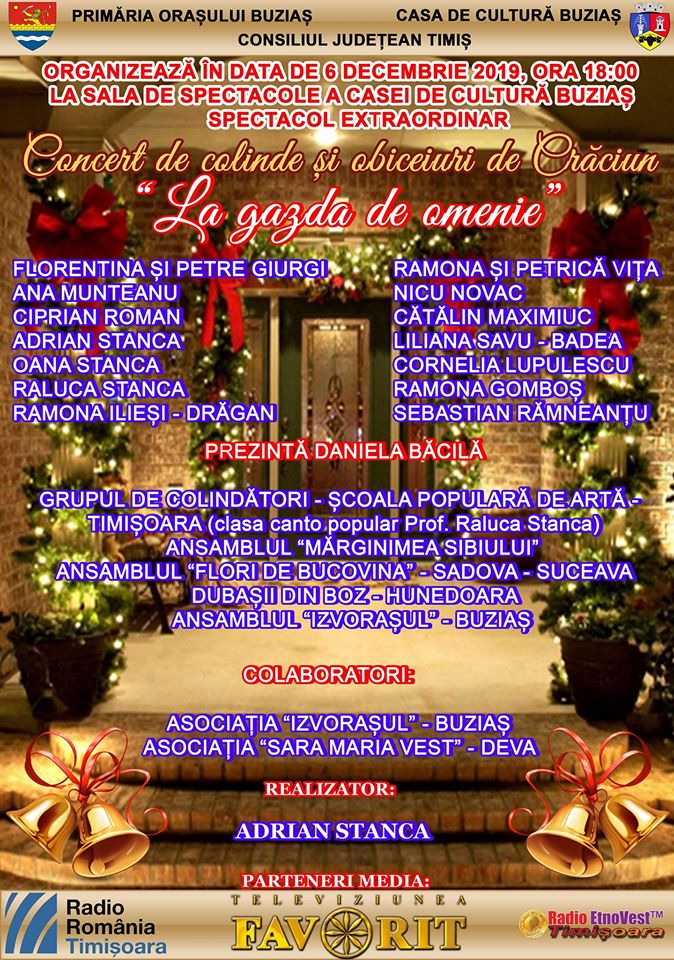 Adrian Stanca, directorul Casei de Cultură din Buziaș, ne spune că programul este alcătuit în două părți distincte: vor începe grupurile de colindători, parte din ele fiind pentru prima dată la Buziaș, iar în partea a doua, publicul se va bucura de cântecele populare aduse de soliștii buzieșeni Oana, Raluca si Adrian Stanca, Liliana Savu Badea, Cornelia Lupulescu, Ramona Torzan Gomboș, Ramona Ilieși Drăgan, Sebastian Râmneanțu și îndrăgiți interpreți din țară: Florentina și Petre Giurgi, Ana Munteanu, Ramona și Petrică Vița, Ciprian Roman, Cătălin Maximiuc.