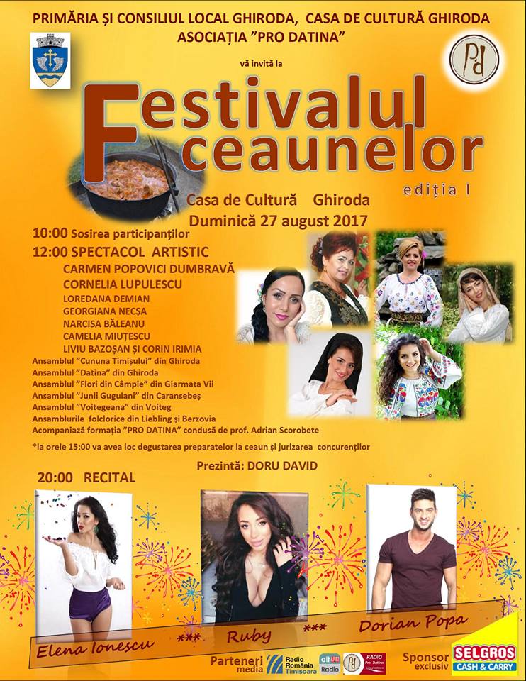 O nouă provocare pentru pasionaţii bucătăriei tradiţionale prin festivalul ce va avea loc duminică, 27 august, la Ghiroda. “Festivalul Ceaunelor” este organizat de Primăria şi Consiliul Local Ghiroda, Casa de Cultură din localitate şi Asociaţia “Pro Datina”.